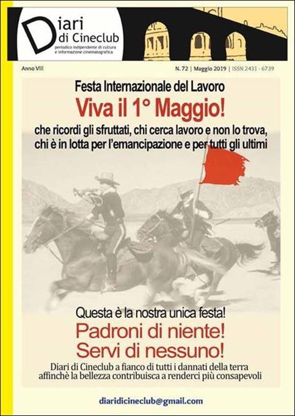 E’online, scaricabile gratuitamente, Diari di Cineclub n. 72 – Maggio 2019, periodico indipendente di cultura ed informazione cinematografica; fra gli articoli di questo numero: Festa Internazionale del Lavoro; Il lavoro nell’arte avvolto da splendore e dramma (DdC); Il cinema per noi è un passato che è un grande futuro, se verrà un nuovo tempo per inventare (Italo Moscati); Bruno Ganz, l’inquietudine nel cinema senza più confini (Tonino De Pace); La grande fuga (del pubblico) (Alberto Castellano); V. Viaggio all’interno del Centro Sperimentale di Cinematografia. Intervista al Preside della Scuola Nazionale di Cinema Adriano De Santis (Susanna Zirizzotti); Il Cinema di Francesco “Citto” Maselli (Giacomo Martini); Per Agnès Varda, la Vecchia Signora del Cinema Europeo (Stefano Beccastrini); Cinema e memoria un incontro mancato (Mino Argentieri); Francesco De Robertis, ufficiale della Regia Marina, regista, a 60 anni dalla sua scomparsa (Adriano Silvestri); Un film di Federico Fellini: Giulietta degli Spiriti. In memoria di Mino Argentieri (Maria Rosaria Capozzi); Mi chiamo Sergio Leone e faccio Western! (Nino Genovese);