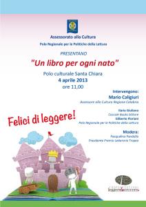 Giovedì 4 aprile, alle ore 11.00, presso il Complesso Santa Chiara di Vibo Valentia, avrà luogo una conferenza stampa volta ad ufficializzare la presentazione dell’iniziativa culturale Un libro per ogni nato, scaturita dalla collaborazione messa in atto tra il TropeaFestival Leggere&Scrivere, l’Assessorato alla Cultura, guidato da Mario Caligiuri, e il Polo Regionale per le Politiche della Lettura. Il progetto va ad inserirsi in una più ampia programmazione a favore del libro e della lettura sostenuta dalla Regione Calabria, a cui hanno anche collaborato i medici pediatri e i Lions Club calabresi.