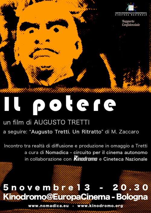 Martedì 5 novembre, alle ore 20.30, a Bologna, presso Cinema Europa @ Kinodromo (Via Pietralata 55/A) avrà luogo un’anteprima dell’evento, con la proiezione dell’opera seconda di Tretti, Il potere, 1971, in collaborazione con la Cineteca Nazionale, cui seguirà il cortometraggio Augusto Tretti. Un ritratto, di Maurizio Zaccaro, il quale sarà presente in sala.