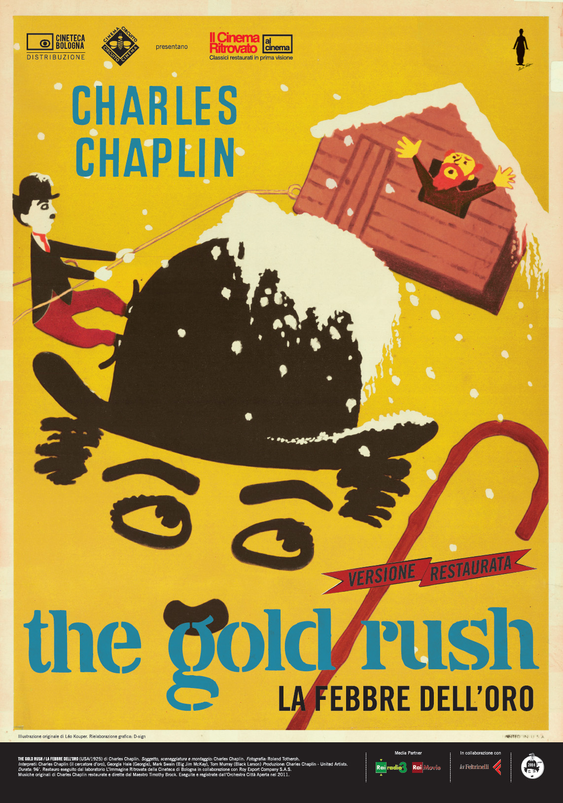 La danza dei panini, Charlot intento a mangiarsi una scarpa (doverosamente bollita e impiattata, con stringhe a parte, la classe non è acqua) o che diventa un pollo gigante, una pericolante capanna in bilico sul baratro tra le montagne innevate, sono tutte celeberrime sequenze de La febbre dell’oro, che ora tornano sul grande schermo grazie al restauro del laboratorio L’Immagine Ritrovata (realizzato in collaborazione con Criterion Collection, Photoplay Productions e Roy Export Company S.A.S.), ripristinando la versione originale muta, restituendo per la prima volta la velocità corretta alle immagini e la partitura musicale opera dello stesso Chaplin, grazie al Maestro Timothy Brock, che l’ha ora incisa nuovamente insieme all’Orchestra Città Aperta.