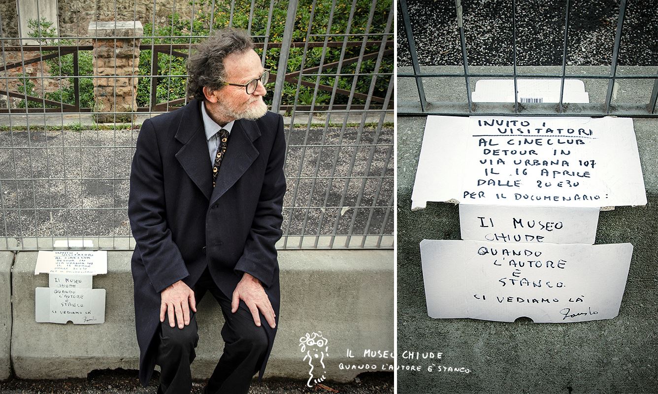 Mercoledì 16 aprile, a Roma, presso il Cineclub Detour (Via Urbana, 107), alle ore 21.00, avrà luogo la prima proiezione ufficiale del documentario Il museo chiude quando l’autore è stanco. All’evento prenderanno parte gli autori, Paolo Buatti e Luca Marino, insieme al protagonista, l’artista Fausto Delle Chiaie, il quale da oltre vent’anni espone i propri lavori nella Capitale, ed è ormai divenuto un volto noto, in particolare per chi transita fra i marciapiedi tra l’Ara Pacis e il Mausoleo di Augusto, luogo che ospita il suo Museo all’aria aperta: sculture, disegni, pitture, prendono forma dagli spunti offerti dal contesto urbano, naturale, sociale, quali oggetti smarriti o abbandonati, rifiuti, piante, dinamiche e comportamenti umani, trasformati appunto in opere, idonee anche, mutuate dall’ironia, a divenire critica sociale o, per esempio, boutade, provocazione.