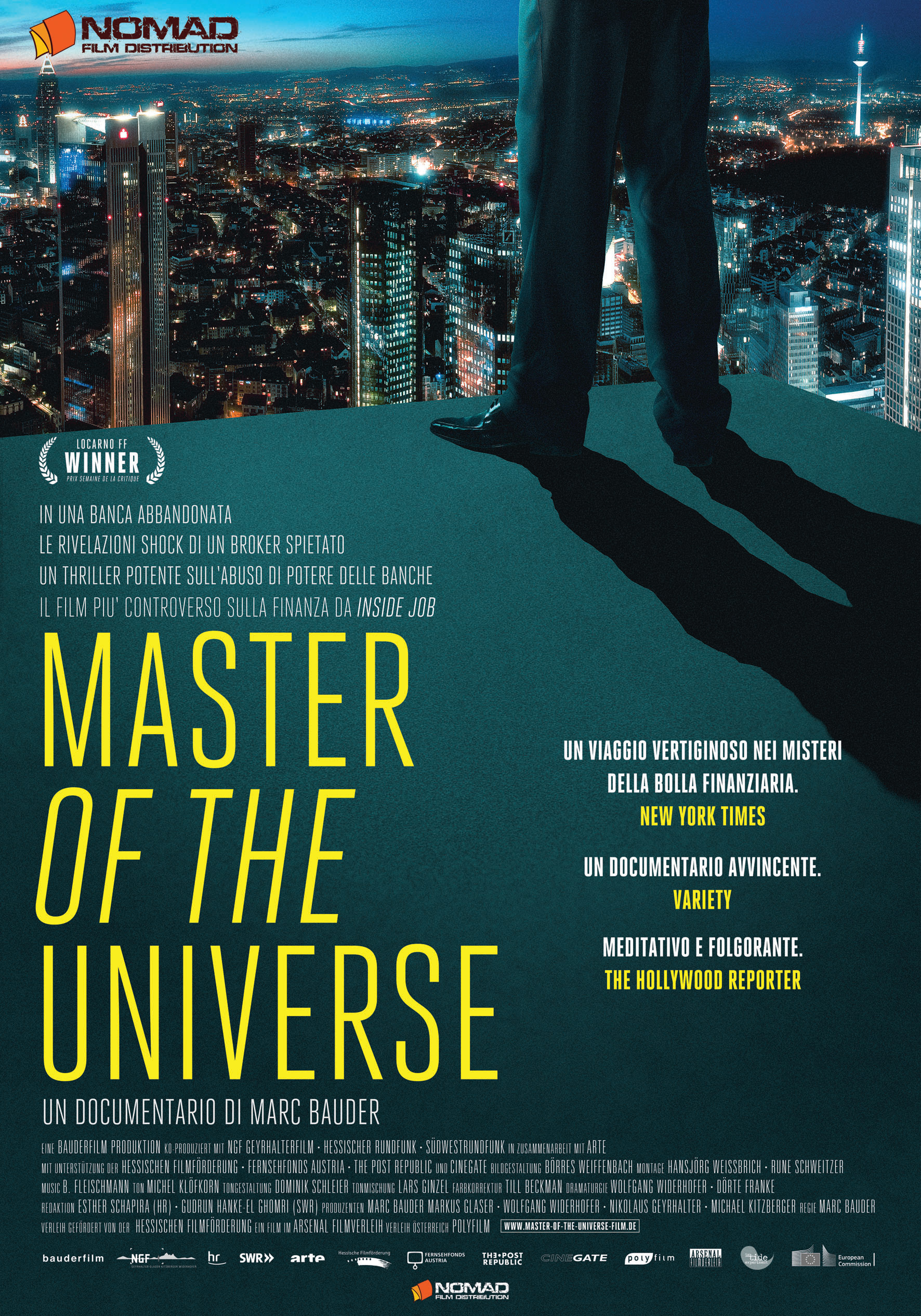 Master of the Universe Regia: Marc Bauder. Produzione: Boerres Weiffenbach.Montaggio: Hansjoerg Weissbrich, Rune Schweitzer. Musica: B. Fleischmann. Effetti sonori: Michel Klöfkorn. Produttori: Markus Glaser, Marc Bauder. Lunghezza: 88 Min. Formato: HD cinemascope, Stereo, DCP. Lingua: Tedesco con i sottotitoli in italiano.