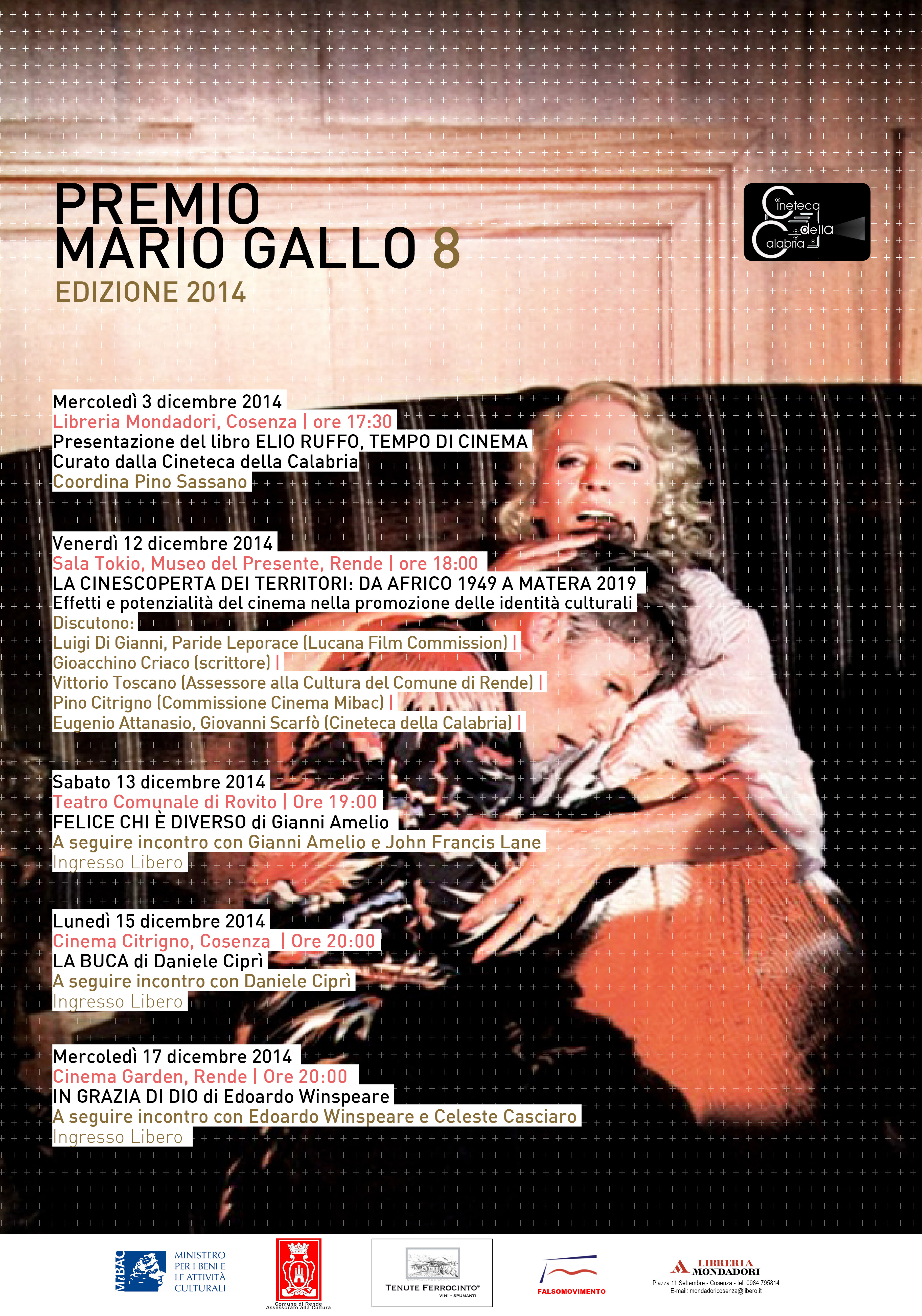 Avrà luogo a Rende, Cosenza e Rovito, dal 3 al 17 dicembre, l’ottava edizione del Premio Mario Gallo, su organizzazione della Cineteca della Calabria, con il sostegno del Mibac, dell’Assessorato alla Cultura del Comune di Rende, dell’associazione Falsomovimento, cui si aggiunge il supporto di alcuni partner privati. Fin dalla sua prima edizione il riconoscimento, intitolato al produttore, critico, sceneggiatore e regista nativo di Rovito, punta ad individuare le opere di maggior qualità fra le tante novità cinematografiche, insieme a quelle idonee a rappresentare il territorio calabrese. Di seguito, gli eventi in programma.