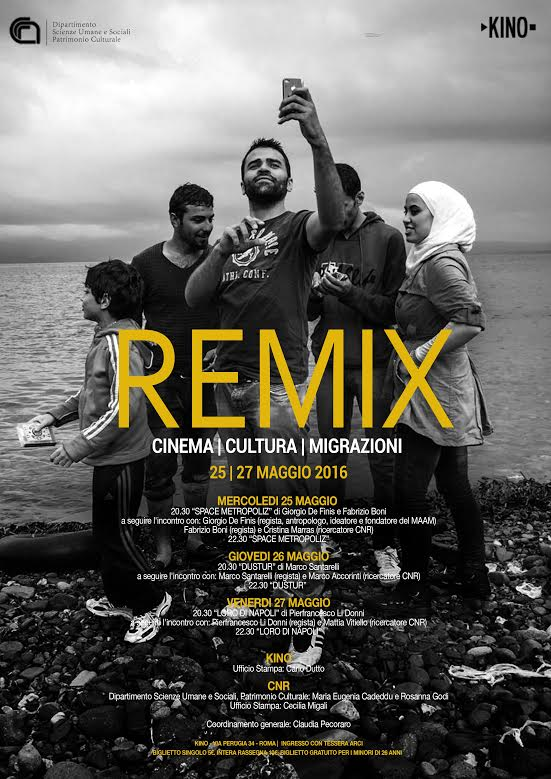 Avrà luogo dal 25 al 27 maggio, presso il cinema Kino di Roma (Via Perugia, 34) la rassegna cinematografica Remix, progetto concepito dal suddetto cinema nel quartiere Pigneto e dal Consiglio Nazionale delle Ricerche – DSU (Dipartimento Scienze Umane e Sociali, Patrimonio Culturale), evento che, nell’intento degli organizzatori, vuole coniugare racconto cinematografico e approccio scientifico per affrontare una realtà sfaccettata come quella delle migrazioni e della convivenza. Tre i film attorno ai quali ruotano proiezioni e incontri della rassegna: Space Metropoliz, di Giorgio De Finis e Fabrizio Boni, Dustur, di Marco Santarelli e Loro di Napoli, di Pierfrancesco Li Donni.