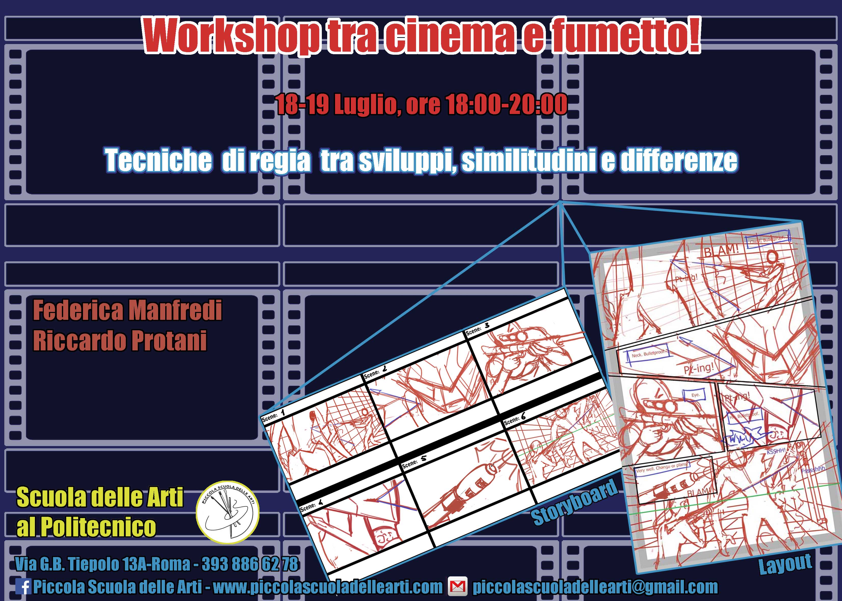 Martedì 18 e mercoledì 19 luglio dalle ore 18.00 alle ore 20.00, alla Scuola delle Arti al Politecnico (via G.B. Tiepolo 13/a) nel quartiere Flaminio a Roma, avrà luogo il workshop Tra cinema e fumetto, dallo storyboard al layout. Due giorni dedicati allo studio delle inquadrature di film e tavole, analizzando le tecniche di regia, similitudini e differenze tra cinema e fumetto, con una particolare attenzione alle reciproche influenze tematiche e artistiche.