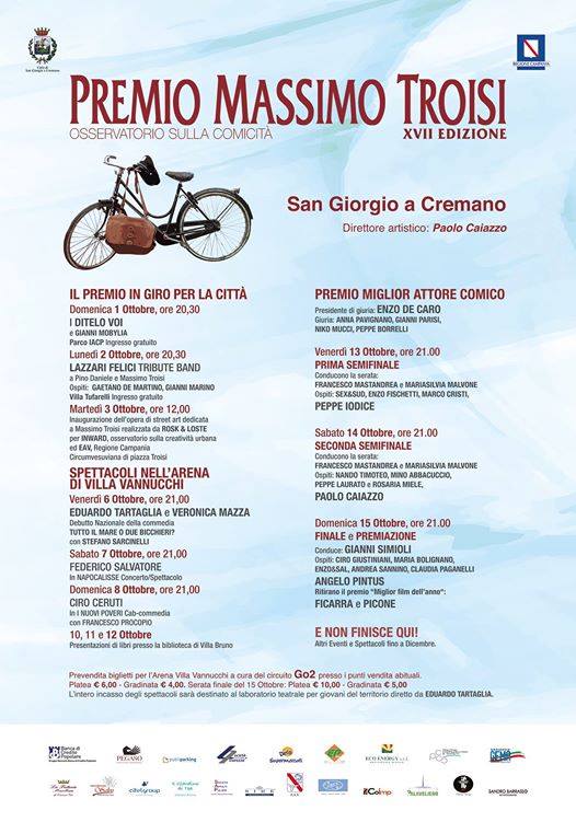 Tutto pronto per la XVII edizione del Premio Massimo Troisi – Osservatorio sulla comicità, la cui direzione artistica è stata affidata a Paolo Caiazzo, attore comico nativo di San Giorgio a Cremano, che si svolgerà da ottobre a dicembre nella città natale di Troisi, con l’obiettivo di ricercare nuovi talenti comici, in virtù della competizione che andrà a svilupparsi attraverso due semifinali (venerdì 13 e sabato 14 ottobre) fino alla finalissima di domenica 15 ottobre quando sarà designato il vincitore tra i sei finalisti scelti dalla giuria presieduta da Enzo De Caro (storico componente de La Smorfia) affiancato da Anna Pavignano, scrittrice e coautrice di Massimo Troisi, composta da Gianni Parisi, Peppe Borrelli e Niko Mucci.