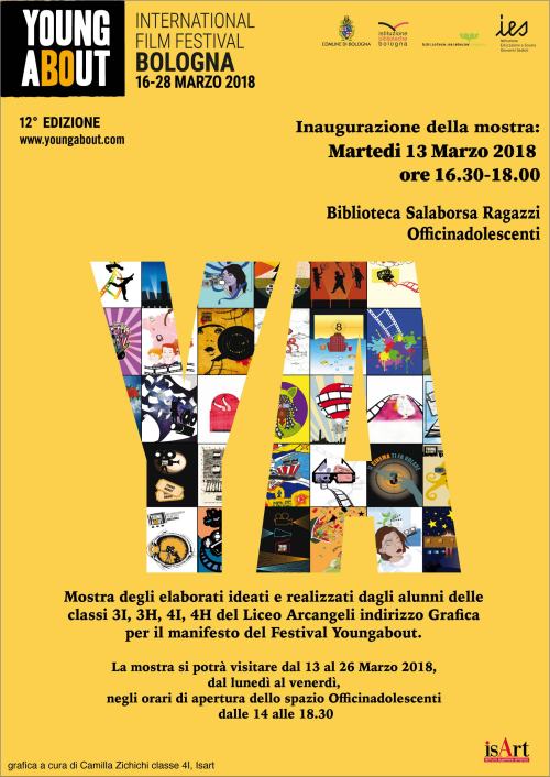 E’ stata inaugurata lo scorso martedì, 13 marzo, nello spazio Officinadolescenti della Biblioteca Salaborsa Ragazzi di Bologna la Mostra degli elaborati ideati e realizzati dagli alunni delle classi 3I, 3H, 4I, 4H del Liceo Artistico Arcangeli-indirizzo Grafica per il manifesto della 12ma edizione di Youngabout International Film Festival (16-28 marzo), confermando così il leitmotiv da sempre proprio della kermesse bolognese, ovvero il proficuo coinvolgimento dei ragazzi all’interno della macchina organizzativa, il loro inserimento in specifici percorsi formativi, idonei a fargli comprendere e valutare il linguaggio proprio della Settima Arte. L’esposizione potrà essere visitata fino a lunedì 26 marzo, dalle 14 alle 18.30.