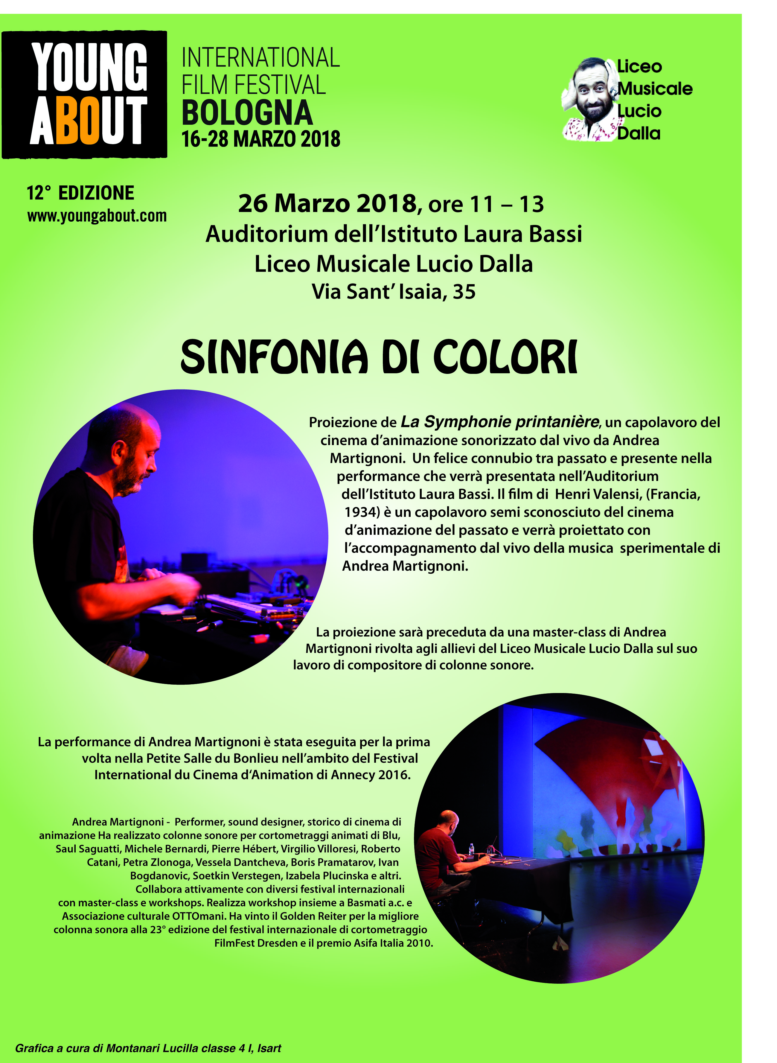 Lo scorso 26 marzo, all’Auditorium dell’Istituto Laura Bassi- Liceo Musicale Lucio Dalla di Bologna, all’interno della XII Edizione di Youngabout International Film Festival, si è tenuta la performance musicale Una sinfonia di colori, che ha visto Andrea Martignoni, sound designer, performer e storico del cinema d’animazione, prodigarsi dapprima in un intervento sull’impiego di varie sonorità nell’ambito cinematografico e poi nella sonorizzazione dal vivo di un prezioso film animato francese del 1934, La Symphonie printanière di Henri Valensi, eseguita per la prima volta da Martignoni nella Petit Salle du Bonlieu nell’ambito del Festival International du Film d’Animation di Annecy 2016. Dopo la performance ho dunque avuto modo d’intervistare Andrea, che ringrazio per la cortese disponibilità.