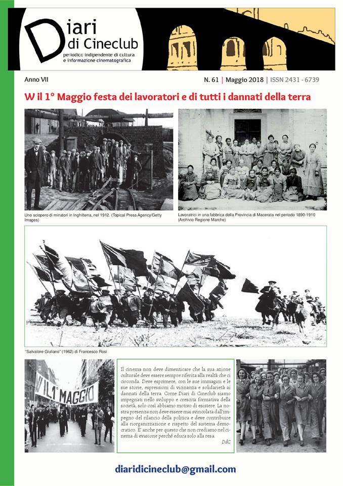 E’ online, scaricabile gratuitamente, Diari di Cineclub n. 61 – Maggio 2018, periodico indipendente di cultura ed informazione cinematografica; fra gli articoli di questo numero: W il 1° Maggio festa dei lavoratori e di tutti i dannati della terra (DdC); L’eredità nefasta di una legge cinema e l’audiovisivo con la complicità di un mondo intellettuale e artistico indifferente (DdC); Senso e non solo. La pittura entra nel cinema (Lucia Bruni); Lanterna Verde (Davide Deidda); Ma che spettatore: marziano o…anziano? (Nuccio Lodato); SardiniaFilmFestival 2018, XIII edizione con tanta voglia di crescere ancora (Salvatore Taras); Il capolavoro restaurato di Jean Renoir: Le crime de Monsieur Lange – Il delitto del signor Lange (1936) (Leonardo Dini); I nuovi film francesi. Festival Rendez Vous a Roma (Giovanni Ottone); Gramsci e il cinema (Stefano Beccastrini); In un film la vita e il pensiero del giovane Karl Marx (Franco La Magna); Il giovane Karl Marx, il cinema reale e senza compromessi di Raoul Peck (Tonino De Pace); Il porto delle nebbie (1938, Marcel Carné)-(Giuseppe Previti); Sette minuti dopo la mezzanotte (A Monster Calls, 2017)– (Antonio Falcone); Morte a Venezia: l’esplicita ricostruzione del passato di Visconti (Orazio Leotta); I Circoli del Cinema come presidio di Resistenza (Martina Mulas); 2001 – Odissea nello spazio (Nino Genovese); Il Decameron di Pasolini (Giorgia Bruni); La televisione del nulla e dell’isteria (XVI)- (DdC).