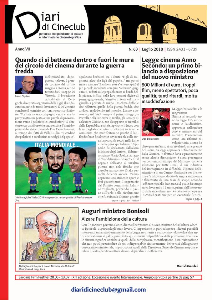 E’ online, scaricabile gratuitamente, il numero 63 – Luglio 2018 di Diari di Cineclub, periodico indipendente di cultura ed informazione cinematografica; fra gli articoli di questo numero: Quando ci si batteva dentro e fuori le mura del circolo del cinema durante la guerra fredda ( Ivano Cipriani); Legge cinema Anno Secondo: un primo bilancio a disposizione del nuovo ministro (Ugo Baistrocchi); Auguri ministro Bonisoli (DdC); Ultimo tango a Parigi, le ossessioni di Bernardo Bertolucci (Tonino De Pace); Il sacrificio del cervo sacro (Giulia Marras); Militanza dimenticata: Gian Maria Volonté protagonista del cinema d’impegno politico e sociale (Leonardo Dini); L’inesprimibile: da Cuore di tenebra ad Apocalypse now (Carmen De Stasio);W il ’68 – Viaggio nel Cinema di quegli anni (Antonello Cossu); La disillusione di Kazan (Roberto Chiesi); Cannes 2018: vince il cinema giapponese. Guida critica ai film del concorso ufficiale del Festival (Giovanni Ottone); Ricordo di Tano Cimarosa a dieci anni dalla scomparsa (Nino Genovese); Michael Haneke, regista dall’arroganza immorale (Àngel Quintana); La ragazza con la pistola (1968-Demetrio Nunnari); Il gigante, uno spaccato della società americana (Giacinto Zappacosta); I magnifici sette di John Sturges, una storia hollywoodiana (Pierfranco Bianchetti); La finestra sul cortile (1954), di Alfred Hitchcock (Giuseppe Previti).
