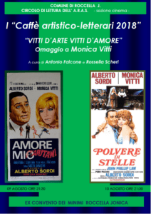 Riporto di seguito la trascrizione del mio intervento introduttivo alla rassegna cinematografica “Vitti d’arte, Vitti d’amore”, organizzata il 9 e il 10 agosto dal Circolo di Lettura dell’ARAS di Roccella Jonica-Sezione cinema all’interno dei Caffè artistico-letterari 2018, che ha visto la proiezione nel cortile dell’ex Convento dei Minimi dei film Amore mio aiutami, 1969, e Polvere di stelle, 1973, entrambi per la regia di Alberto Sordi. Un rinnovato grazie di cuore alla compagna di viaggio Rossella Scherl, autrice anch’essa di un emozionante intervento introduttivo, nonché al Circolo di Lettura, al Comune di Roccella e al service di Angelo Fantò che ha garantito una perfetta visione al numeroso e partecipe pubblico intervenuto. Preziosa per la preparazione dell’intervento si è rivelata la lettura del libro La dolce Vitti (Edizioni Sabinae/Luce Cinecittà, 2018).