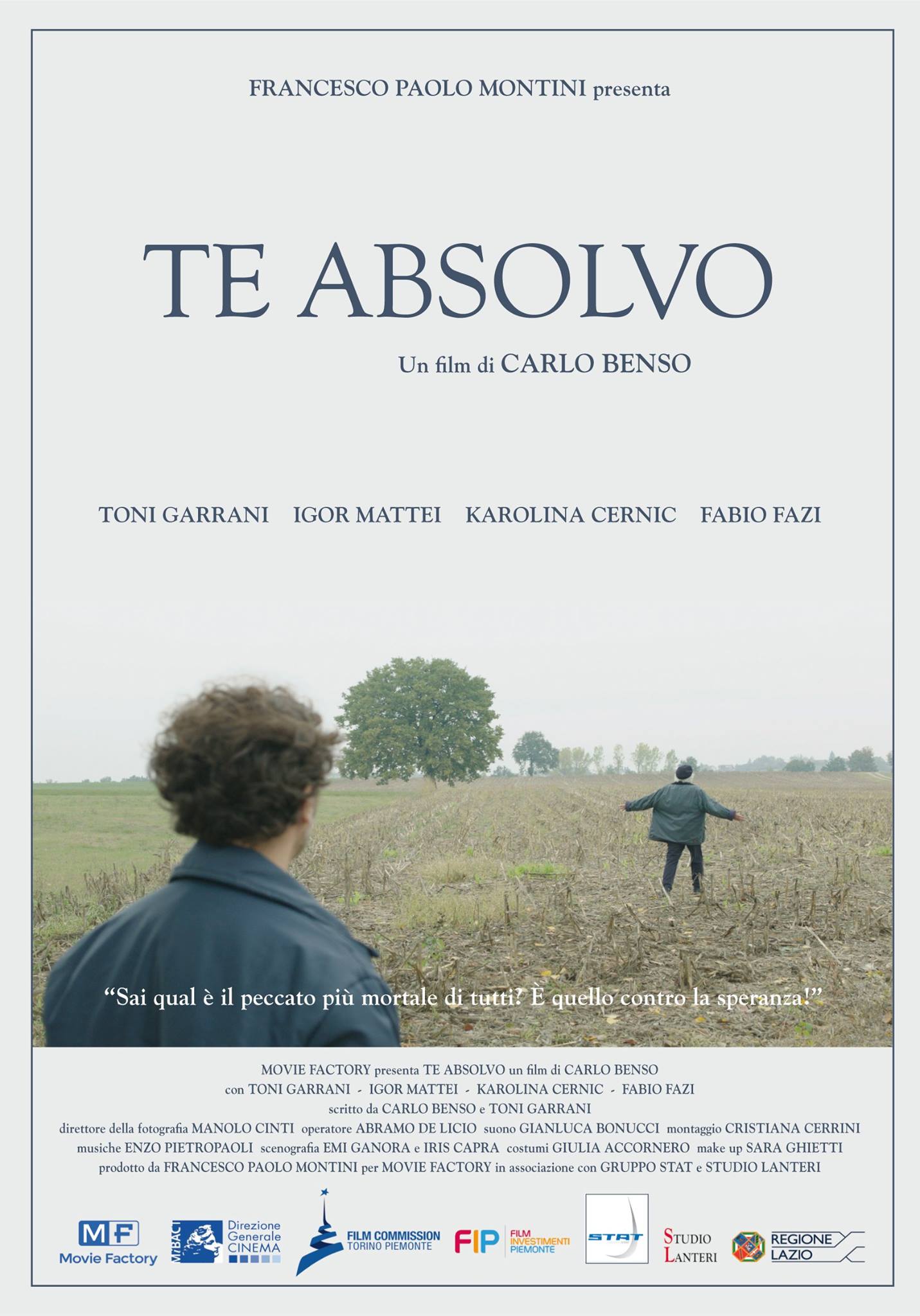 Diretto da Carlo Benso, alla sua opera seconda dopo l’esordio nel 2015 con Fuorigioco, anche autore della sceneggiatura insieme a Toni Garrani, Te absolvo si sostanzia alla visione come un noir dai risvolti esistenziali, facendo sì che il piccolo paese del Monferrato diventi non solo il proscenio dei vari accadimenti ma un vero e proprio protagonista, microcosmo rappresentativo di certa provincia rinchiusa all’interno delle proprie convenzioni ed abitudini, i cui abitanti, nel coltivare la quotidiana esistenza, indulgono, per dirla con Fabrizio De Andrè, nel dare buoni consigli per non poter più dare cattivo esempio, quando non assumano le parvenze dei sepolcri imbiancati d’evangelica memoria.