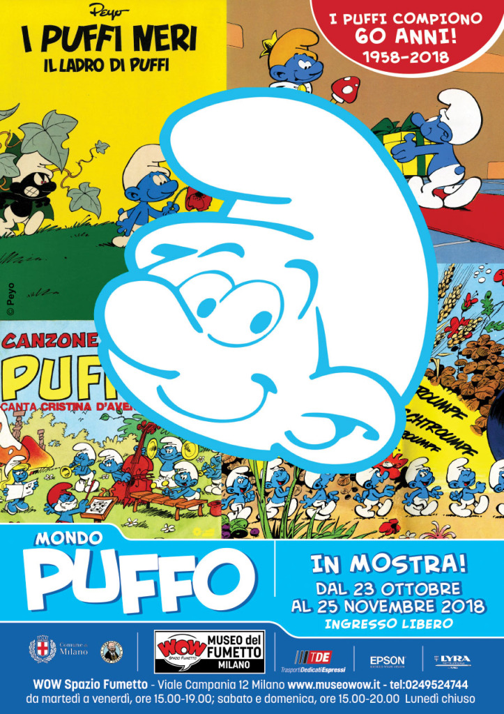 Si è aperta ieri, martedì 23 ottobre, a Milano, nei locali di WOW Spazio fumetto, per concludersi domenica 25 novembre, la mostra Mondo Puffo, un’esposizione-omaggio agli omini blu, alti due mele o poco più, come cantava Cristina D’Avena, che, puffarbacco, festeggiano i 60 anni di carriera. Se ne racconta la nascita, da quando comparvero, creati dal belga Peyo, nel 1958, sulle pagine de Le Journal de Spirou, come semplici comparse, fino al successo dei cartoni animati in tv negli anni Ottanta e dei recenti film al cinema, con, fra l’altro, divertenti pannelli tematici ad approfondirne gli aspetti più curiosi e puffosi. Andando alle origini, Gli Schtroumpfs, questo il loro nome originale, nato per caso e senza alcun significato preciso, appaiono per la prima volta il 23 ottobre 1958, in una striscia a fumetti, Johan & Pirlouit (per noi, John & Solfami), della quale Peyo era autore, sul citato Le Journal de Spirou.