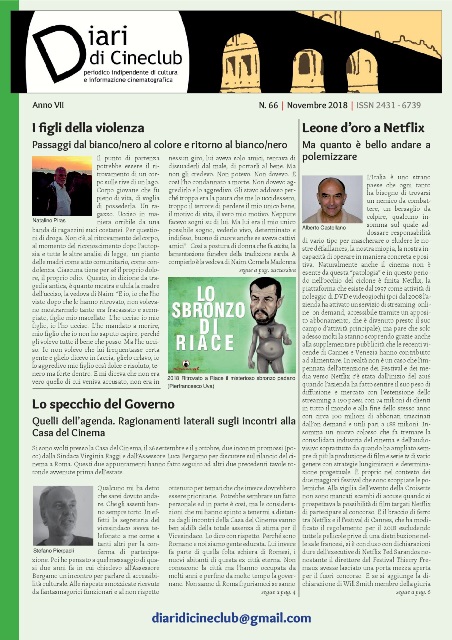 E’ online, scaricabile gratuitamente, Diari di Cineclub n. 66 – Novembre 2018; fra gli articoli di questo numero: I figli della violenza (Natalino Piras); Leone d’oro a Netflix. Ma quanto è bello andare a polemizzare (Alberto Castellano); Lo specchio del Governo. Quelli dell’agenda (Stefano Pierpaoli; Lotte, conflitti, diritti – Napoli in festival per i 10 anni del suo cinema dei diritti umani (Maurizio del Bufalo); Ricatto e intolleranza pesano sulla nostra cinematografia (Cesare Zavattini); Un indimenticabile (ma in realtà quasi dimenticato) Ophuls italiano (Stefano Beccastrini); Il primo uomo (First Man) di Damien Chazelle (Giovanni Ottone); Viaggio nella Cappella Sistina. L’arte mostrata al grande pubblico (Giacinto Zappacosta); Luchino Visconti, un’ossessione a Ferrara (Maria Cristina Nascosi); Casque d’or di Jacques Becker (1952). Giuseppe Previti; L’immortale Sherlock Holmes sul grande schermo. (Fabio Massimo Penna); L’amica geniale di Saverio Costanzo (2018). Spettatrice Qualunque; Un paese di Calabria che non diverrà una città fantasma (Marino Demata); Donne e cinema. L’eredità al femminile ( Lucia Bruni); Marcel Carné e Jacques Prevert, il cinema nella poesia la poesia nel cinema (Pierfranco Bianchetti); A star is born – una serie di note che si ripete (Andrea Fabriziani); Disobedience (Giulia Marras); Festival del Cinema Latino Americano di Trieste 2018 (Rodrigo Diaz); Scarpette rosse (The Red Shoes, 1948). Antonio Falcone; L’ala o la coscia? (1976). Louis De Funès. Spumeggiante paladino del buon gusto (Demetrio Nunnari); 37. edizione delle giornate del cinema muto di Pordenone (Franco La Magna); Padre padrone (1977) di Paolo e Vittorio Taviani (Maria Antonietta Fenu); Stan & Ollie (2018) di Jon S. Baird (Ignazio Gori); Il premio collaterale di Diari di Cineclub al #RomaFF13 (DdC); La televisione del nulla e dell’isteria (XXI). DdC; Omaggio. Viale del tramonto (1950) di Billy Wilder. DdC.