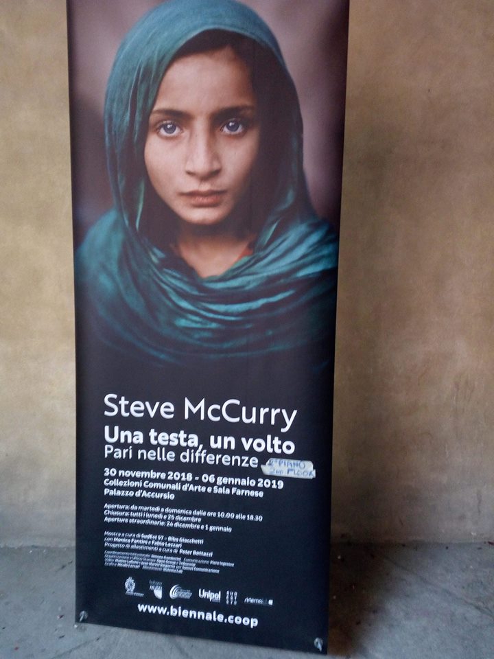 Inaugurata lo scorso 30 novembre, in occasione della Biennale della Cooperazione, è tuttora visitabile, fino al 6 gennaio, a Bologna, all’interno della Sala Farnese di Palazzo D’Accursio, la mostra fotografica Una testa, un volto. Pari nelle differenze, 40 grandi ritratti, di cui alcuni inediti, del fotoreporter americano Steve McCurry, quattro volte vincitore del World Press Photo. Le foto sono esposte su strutture antropomorfe in ferro battuto, ideate dallo scenografo Peter Bottazzi, posizionate all’interno della sala come fossero persone in cammino.