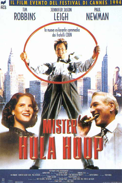 Un ultimo cenno alle prove attoriali: se Robbins è una sorta di cocktail fra James Stewart e Gary Cooper, molto bella è anche l’interpretazione di Jane Jason Leigh, che riecheggia alcuni ruoli di Rosalind Russell e Katherine Hepburn. Concludendo, Mister Hula Hoop è, probabilmente, da ritenersi un film minore all’interno della filmografia dei Coen, un puro e semplice divertissement che va ad agitare (e in parte a mescolare) un repertorio cinefilo a loro caro, ma che riesce, a tratti, ad essere incisivo e graffiante all’interno della cornice da “bella favola”, mantenendo un’impagabile freschezza alla visione ed una godibilità senza tempo, come i migliori classici hollywoodiani. Da riscoprire.