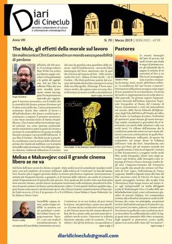 E’ online, scaricabile gratuitamente, Diari di Cineclub n. 70 – Marzo 2019, periodico indipendente di cultura ed informazione cinematografica; fra gli articoli di questo numero: The Mule, gli effetti della morale sul lavoro (Àngel Quintana); Pastores (Natalino Piras); La paternità e il fallimento, guardati dalla veranda, nel cinema di Clint Eastwood (Tonino De Pace); Il Corriere – The Mule e la controfigura sonora italiana di Clint Eastwood, Michele Kalamera (Tiziana Voarino); Le ragioni dei pastori (DdC); La ragazza Cecilia Mangini (Elisabetta Randaccio); Viaggio all’interno del Centro Sperimentale di Cinematografia: Alberto Crespi (Susanna Zirizzotti); La valenza emozionale del cinema (Alberto Castellano); Vice – L’uomo nell’ombra (Giulia Zoppi); Da Tortona: ecco David Cronenberg secondo Emanuela Martini (N.L.); Un gatto dallo sguardo graffiante. L’arte di Chaplin secondo Federico Fellini (Enzo Pio Pignatiello); Occorrerà la dispensa per vedere un bel film? (Mino Argentieri); Buon compleanno Faber. Nel solco anarchico di Fabrizio De André (Marco Asunis); Copperman. Il cinema è poesia (Mario Dal Bello); Il primo re. La nascita di Roma tra suggestioni e lingua latina (Giacinto Zappacosta); Il signore e la signora Smith (Mr. & Mrs. Smith) di Alfred Hitchcock (Giuseppe Previti); Una parabola sulle vittime escluse dalla Storia: Porcile (Giorgia Bruni); Mamma Roma e Pasolini: un difficile incontro (Barbara Rossi); Tre donne da Oscar. La Favorita (Paola Dei); La para(da)nza di Berlino (Paolo Minuto); Cappello a cilindro (Top Hat, 1935) (Antonio Falcone); Les choristes (di C. Barratier, 2004). La forza salvifica del canto (Demetrio Nunnari); Mille lire al mese – Il cinema italiano degli anni Trenta (Pierfranco Bianchetti); Strade di notte – Il cinema di Walter Hill. Rassegna di Band Apart (Raffaele Cannas); La televisione del nulla e dell’isteria (XXV) DdC; Omaggio. Ugo Tognazzi. Io la conoscevo bene (1965) di Antonio Pietrangeli (DdC).