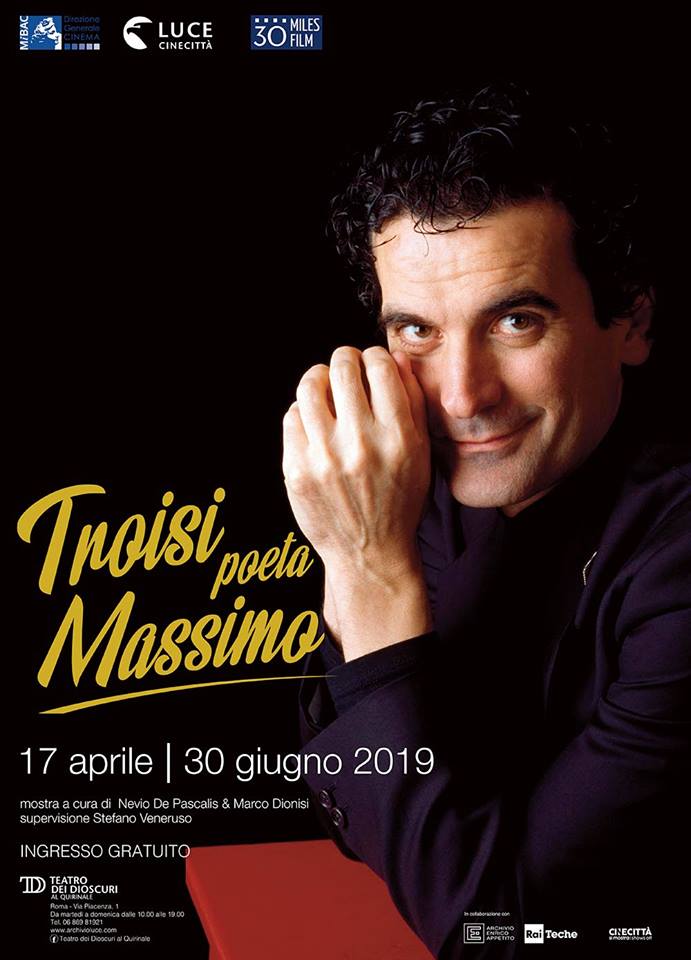 E’ visitabile da oggi, mercoledì 17 aprile, con proseguimento fino al 30 giugno, al Teatro dei Dioscuri (Quirinale) di Roma, ad ingresso gratuito, la mostra Troisi poeta Massimo organizzata e promossa da Istituto Luce-Cinecittà con 30 Miles Film, in collaborazione con Archivio Enrico Appetito, Rai Teche, Cinecittà si Mostra, curata da Nevio De Pascalis e Marco Dionisi, con la supervisione di Stefano Veneruso, nipote di Troisi.
