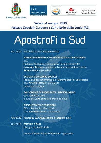 Oggi, sabato 4 maggio, a partire dalle ore 18.00, nella sale di Palazzo Speziali Carbone, a S. Ilario dello Jonio, avrà luogo la manifestazione Apostrofi a Sud, su temi nodali per il meridione: la forza dell’associazionismo, l’importanza della scuola, lo sviluppo delle attività produttive e l’energia propulsiva della cultura. L’evento è promosso e organizzato dall’amministrazione comunale insieme ad Apostrofi a Sud, blog collettivo di approfondimento, in collaborazione con Caffè letterario Mario La Cava, Slow food e BLU (Birrai della Locride Uniti). Dopo i saluti del sindaco Pasquale Brizzi, spazio sul tema Associazionismo e politiche sociali in Calabria con Federica Roccisano, Cooperativa sociale Hermes 4.0, Francesco Mollace, portavoce Forum Terzo Settore Locride, Jacopo Giuca, giornalista; a seguire Scuola e sviluppo sociale, proiezione del cortometraggio Maramandra di Lele Nucera, con il regista e il giornalista Antonio Falcone; parleremo di Sociologia di prossimità