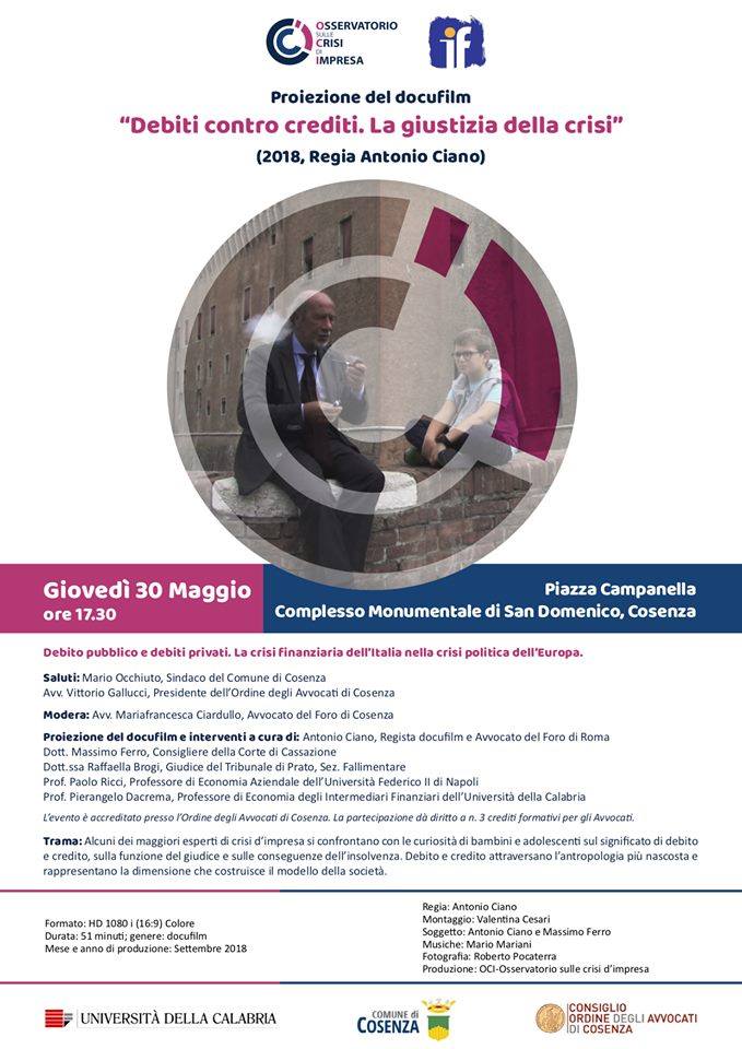 É quanto si premura di mettere in evidenza, con suggestiva scorrevolezza narrativa, il docufilm Debiti contro crediti- La giustizia della crisi, diretto da Antonio Ciano, avvocato, anche sceneggiatore insieme a Massimo Ferro, Consigliere di Cassazione e Coordinatore OCI- Osservatorio sulle crisi d’impresa, associazione di magistrati senza fini di lucro, nell’intento precipuo di offrire congrua visualizzazione ai lavori portati avanti da quest’ultima a partire dal 2010 sul territorio nazionale (con eventi a Bologna, Ferrara, Ancona, Lecce, L’Aquila, Siena, Roma, Montecatini), studiando ed approfondendo le varie implicazioni sociali conseguenti alle crisi economiche, tanto dei singoli soggetti quanto degli ordinamenti statali nel loro complesso.