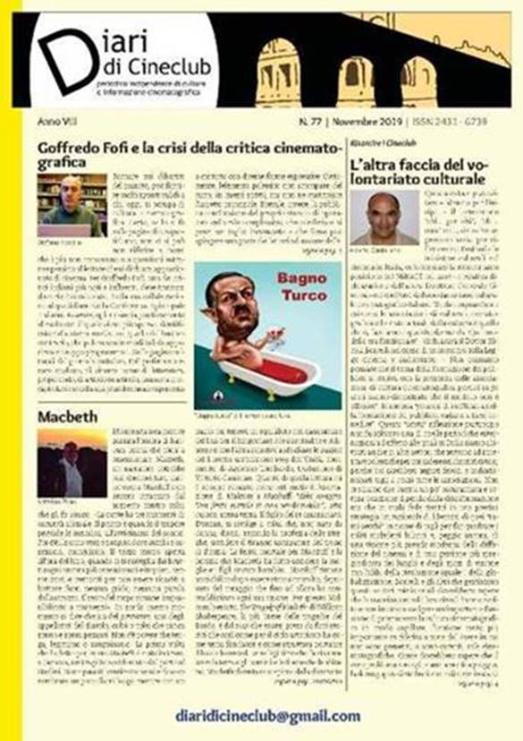 E’ online, scaricabile gratutitamente, Diari di Cineclub n. 77 – Novembre 2019, periodico indipendente di cultura ed informazione cinematografica; fra gli articoli di questo numero: Goffredo Fofi e la crisi della critica cinematografica (Stefano Macera); L’altra faccia del volontariato culturale (Alberto Castellano); Macbeth (Natalino Piras); Risarcire i cineclub (Mino Argentieri); La diffusione del cinema con produzione, distribuzione, esercizio (Mario Franco); Giuseppe Dosi. L’artista poliziotto (Antonino Orlando); Impressionisti nascosti a Roma (Mario Dal Bello); Antonio Capuano: il cinema del reale napoletano (Tonino De Pace); #RomaFF14: Alla Festa del Cinema di Roma con John Michael Turturro attore, regista, sceneggiatore (Viviana Del Bianco)-Al film La Belle Époque di Nicolas Bedos il premio Diari di Cineclub alla Festa del Cinema di Roma (DdC); Una delle sfide di Pasolini? Far amare la scuola. L’esempio di Ciampino (Patrizia Gradito); Federazione portoghese di Cineclub (DdC); La conquista del West (Federico La Lonza); Poetiche. Io vado madre (Abdulla Goran); Abbiamo incontrato Elijana Popova docente del corso di recitazione del CSC (Susanna Zirizzotti); Giulio Romano, due splendide mostre a Mantova lo omaggiano (Maria Cristina Nascosi); Masina e Mastroianni: due attori feticci di Fellini (Abderrahim Naim); I forti richiami del cinema europeo in Woody Allen (Àngel Quintana); Ad Astra e la misteriosa ragione del procedere (Giacomo Napoli); La Nostra Pietra, Alessandro Soetje (Giulia Zoppi); Alla scoperta del viaggio dantesco: la Divina Commedia (Martina Michelangeli); Medea, la barbara, la perseguitata, l’assassina (Giacinto Zappacosta); C’era una volta la nostra piccola Hollywood toscana (Pierfranco Bianchetti); Solo tre parole: amore, amore, amore (Antonio Loru); Rififi (1956) di Jules Dassin (Giuseppe Previti); Radio Amiche di Diari di Cineclub, programmazione di Ottobre: Cult Fiction | Unica Radio (Tore Uccheddu); Radio Brada. Canale di Diari di Cineclub (DdC); DdCR| Diari di Cineclub Radio (DdC); Kubrick. Un genio dalla fotografia al film (Fabio Massimo Penna); Quegli ebrei non devono giocare (Ignazio Gori); S.O.S. Stanlio e Ollio: il recupero dell’ultimo utopico addio di Laurel & Hardy al grande schermo (Enzo Pio Pignatiello e Simone Santilli); La giovane età (Le jeune ahmed) di Jean-Pierre e Luc Dardenne (Giovanni Ottone); Il sindaco del Rione Sanità (G.O.); Soldati e Lavagnino, parabole incrociate (Nuccio Lodato); 6° Firenze FilmCorti Festival: Una sessione autunnale da record (Marino Demata); Vince Voice/Kore del regista giapponese Takeshi Kushida (Paola Dei); Voice, il corto vincitore (Andrea Fabriziani); 4. Concorso opere letterarie – Rive Gauche (Maria Rosaria Perilli); Il canto della caduta di Marta Cuscunà, storia di Resistenza al femminile (Giuseppe Barbanti); Le giornate del cinema muto di Pordenone 2019 (Nino Genovese); L’evoluzione non è un pranzo di gala (Nicola Santagostino); Ricordando Luciano Salce: il federale (1961) (Antonio Falcone); Hannah Arendt di Margaret Von Trotta: io devo comprendere (Carmen De Stasio); Cinema e stili di vita (Adriano Silvestri); Castello Film Festival – Castel di Sangro (Aq) DdC; Essere e non essere nella riproduzione cinematografica della realtà fisica (Giovanni Mazzallo); Per amore del bel canto. Il cinema dei castrati (Lucia Bruni); FICC Circolo del Cinema Cesare Zavattini Reggio Calabria 2019 (DdC); Sofia Loren (Barbara Rossi); Cineforum 588 (DdC); Premio Ermanno Olmi 1° edizione (DdC); Diari di Cineclub | YouTube (Nicola De Carlo); Il Clima che verrà. Festival del Cinema dei Diritti Umani di Napoli (DdC); La televisione del nulla e dell’isteria (XXXII). DdC; Omaggio. Interstellar (2014) di Christopher Nolan ;la vignetta “Bagno turco” è del maestro Pierfrancesco Uva.