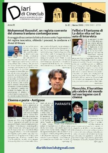 E’ online, scaricabile gratuitamente, Diari di Cineclub n. 81 – Marzo 2020; fra gli articoli di questo numero: Mohammad Rasoulof, un regista coerente del cinema iraniano contemporaneo (Giovanni Ottone); Fellini e il fantasma di La Dolce Vita nel tessuto di Intervista (Roberto Chiesi); Cinema e peste – Antigone (Natalino Piras); Pinocchio, il burattino più celebre del mondo nel suo legame con il cinema (Nino Genovese); Mino Argentieri. Cecilia Mangini ricorda Mino a tre anni dalla sua scomparsa (Cecilia Mangini); Premio Centottanta (DdC); La ragazza d’autunno (Dylda). Giulia Zoppi; La vita di Jim Dine (Mario Dal Bello); Transsiberian (2008). Federico La Lonza; Wounds: l’autofagia del postmoderno sintetizzata in un film (Giacomo Napoli); Fellini – Felliniana e Ferretti, splendida allitterazione… (Maria Cristina Nascosi); ‘CCA NISCIUN È FESS! (DdC); Accattone bloccato dalla censura (Mino Argentieri); Romanistan, un progetto di Luca Vitone (Lisa Andreani); Un sogno rimasto in sospeso: John Fante e Orson Welles (Ignazio Gori); Orson Welles: un genio solitario (Lucia Bruni); Parasite: gli stranieri conquistano l’Occidente (Andrea Fabriziani); L’invasione dei parassiti asiatici e le paure hollywoodiane (Àngel Quintana); Un’attività fondamentale del mondo editoriale: l’editing letterario (Maria Rosaria Perilli); Bella figura per la regia di Roberto Andò (Giuseppe Barbanti); Premio cinema giovane e festival delle opere prime 2020, il cinema giovane italiano non è mai in crisi (Catello Masullo); The party nel gioco metaforico del reale (Carmen De Stasio); Kirk Douglas tra Guthrie jr e Hawks: Jim Deakins, Elizabeth Threatt, lo zampino di Occhio d’Anatra (Nuccio Lodato); Nulla si sa tutto si immagina. Fellini oggi ieri domani (Leonardo Dini); Abbiamo ricevuto: Il giovane Fellini. Enzo Lavagnini; Il Far West, la frontiera, il mito (Fabio Massimo Penna);D’amore non si muore. Intervista a Lino Capolicchio (Susanna Zirizzotti); Stanlio & Ollio sul canale Diari di Cineclub YouTube (DdC); Virgilio, l’Eneide, la Romanità, lo sceneggiato (Giacinto Zappacosta); Camilla (1954) di Luciano Emmer. Demetrio Nunnari; 5° La Spezia Film Festival – 2020 (Paola Settimini); Jojo Rabbit (Paola Dei); Anni Cinquanta, a Cinecittà arrivano i registi milanesi (Pierfrancesco Bianchetti); Scherzi della memoria (Antonio Loru); Sanscemo: l’armadio degli scheletri (Dott. Tzira Bella); La vita nascosta – Hidden Life (Giulia Marras); Alice e il sindaco… l’albero e la mediateca (Tonino De Pace); Vite vendute (Le salaire de la peur) di Henri George Clouzot (1953). Giuseppe Previti; I vitelloni (1953) di Federico Fellini. Antonio Falcone; Notizie da Sherwood: La Legge Cinema della Regione Lazio si adegua a quella nazionale. Luciano Saltarelli; Il Centro Sperimentale di Cinematografia a Lecce. DdC; Un centenario illustre e significativo. Gerardo Guerrieri, ovvero una vita per Eleonora Duse (n.l.); Marilyn Monroe (Barbara Rossi); Festival di Sanremo 2020! Finalmente tutti inclusi! (Tiziana Voarino); Bif&st 2020 (Adriano Silvestri); ValdarnoCinema Film Festival (DdC); Diari di Cineclub | YouTube (Nicola De Carlo); E’ uscito Cineforum n. 591 (DdC); La televisione del nulla e dell’isteria (XXXVI). DdC; Omaggio. Nosferatu il principe della notte (1979) di Werner Herzog. DdC; La vignetta “Parasite 4 Oscar” è del maestro Pierfrancesco Uva; La caricatura di Filippo De Santis è del maestro Luigi Zara; Il détournement “’CCA NISCIUN È FESS!” è del maestro Massimo Pellegrinotti.