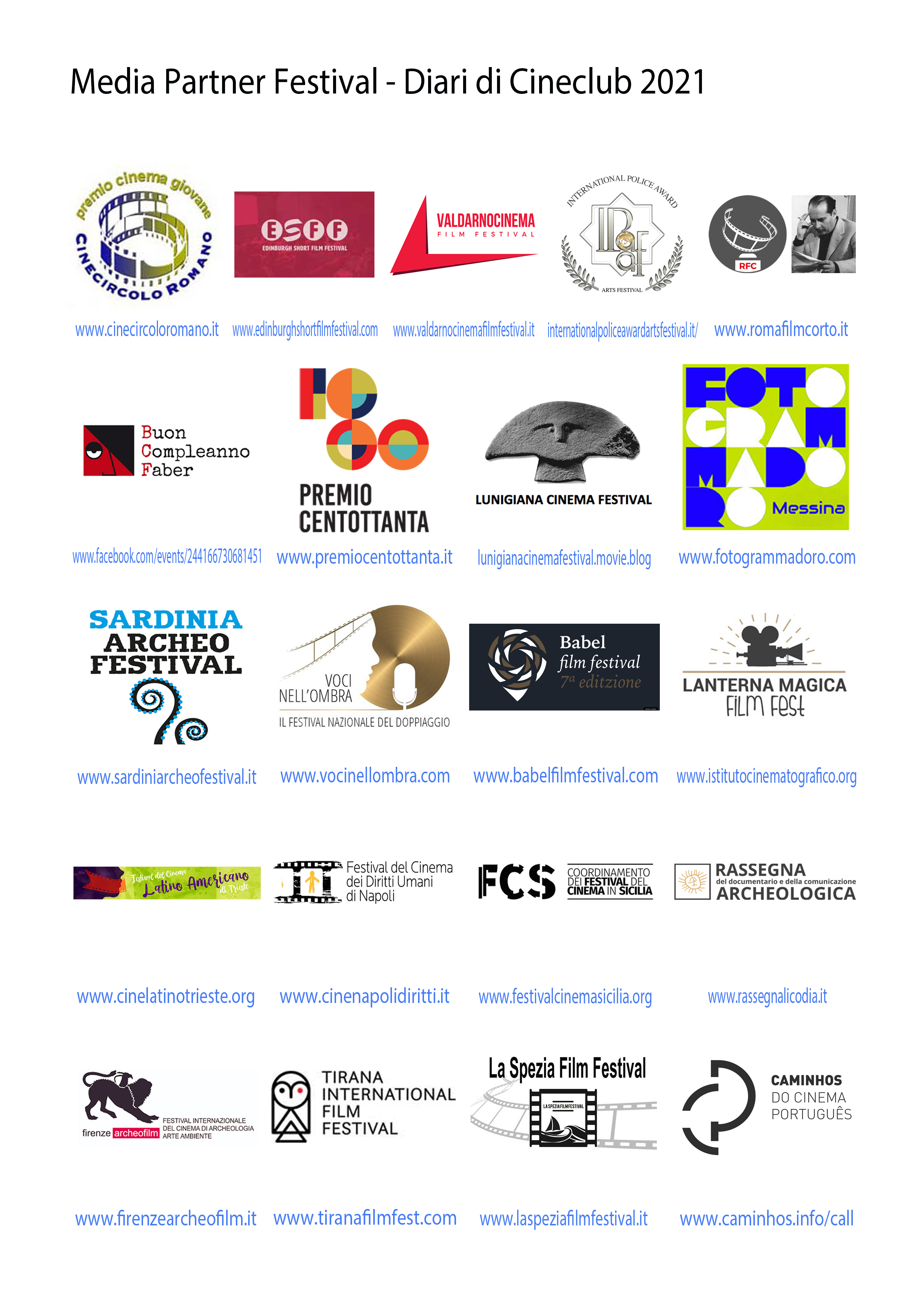 Diari di Cineclub anche nel 2021 offre, in qualità di media partner, il suo impegno, la sua passione e la sua professionalità a vari Festival e manifestazioni nazionali ed internazionali di grande rilevanza, pronti a ripartire, nonostante le mille difficoltà, e ad essere supportati, rimarcando inoltre la possibilità di nuove adesioni.