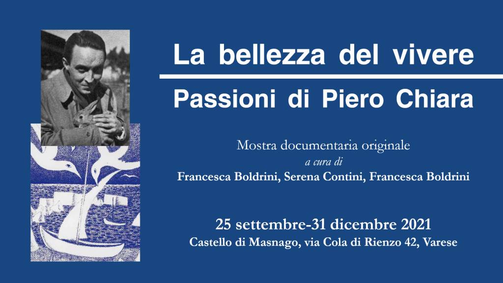 Per tutto ciò l’Associazione Amici di Piero Chiara, che da decenni tiene viva la memoria dello scrittore, gli rende omaggio con una mostra dedicata alle passioni che illuminarono la sua esistenza, in corso di svolgimento dal 25 settembre a Varese, al Castello di Masnago, via Cola di Rienzo 42, per concludersi il 31 dicembre.