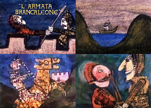 Emanuele Luzzati, nel 1957, insieme a Giulio Gianini diede vita alla coppia d’oro del cinema d’animazione italiano, offrendo una poesia animata che tramite la tecnica del découpage ingloba tutta la cultura del teatro, congiunta al disegno e ad un tocco di genio senza dimenticare la poesia e il senso della fiaba: i personaggi, sebbene siano solo pezzetti di carta che si spostano su fondali, sembrano uscire da questi stessi scenari per diventare colore in movimento, per un felice connubio tra cinema, grafica ed inventiva narrativa, che valse al duo, tra i tanti riconoscimenti internazionali, due candidature all’Oscar, nel ’64 (La gazza ladra) e nel ’73 (Pulcinella). Opera loro, tra l’altro, gli indimenticabili titoli di testa de L’armata Brancaleone, ’66, e di Brancaleone alle crociate, ’70, entrambi diretti da Mario Monicelli.