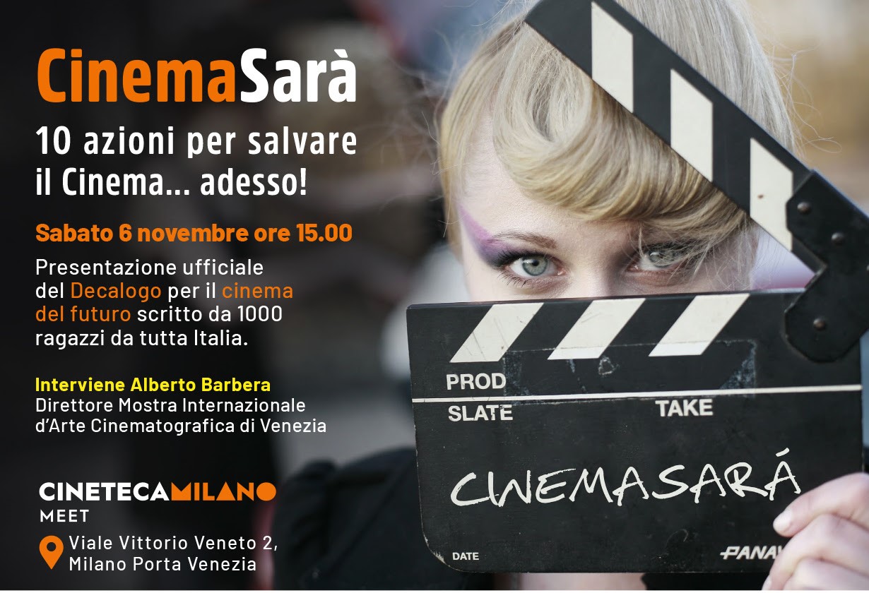 Sabato 6 novembre alle ore 15.00 a Cineteca Milano Meet con la partecipazione di Alberto Barbera, Direttore della Mostra Internazionale d’Arte Cinematografica di Venezia, verrà presentato il Manifesto del progetto di partecipazione e cittadinanza attiva CinemaSarà, che Cineteca Milano si impegnerà a consegnare nella mani di istituzioni nazionali, dei rappresentanti di categoria, delle istituzioni scolastiche per sostenere e dare voce al pubblico del futuro perché possa influenzare le modalità di fare e fruire il Cinema d’ora in poi.