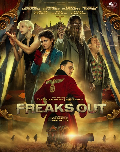 Presentato, in concorso, alla 78ma Mostra Internazionale d’Arte Cinematografica di Venezia, conseguendo una serie di premi collaterali*, fresco di 16 candidature ai David di Donatello (ex aequo con E’ stata la mano di Dio, di Paolo Sorrentino), Freaks Out, secondo lungometraggio di Gabriele Mainetti, anche autore della sceneggiatura insieme a Nicola Guaglianone, credo possa essere incluso nel novero di quei segnali obiettivamente concreti relativi ad un sempre auspicato rinnovamento del nostro cinema, inteso a riallacciarsi, idealmente ma non solo, ad un passato, neanche tanto lontano, dove il ricorso al genere, fra intuizioni spesso felici e nell’ambito di un combinato disposto tra creatività e artigianalità, consentiva un’offerta cinematograficamente diversificata.