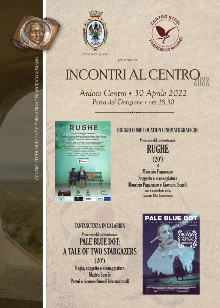 Incontri al centro è il titolo con il quale riprendono gli incontri cinematografici al Centro Studi Ricerche e Formazione Francesco Misiano, con sede alla Porta Dongione di Ardore, interrotti nel febbraio del 2020 causa pandemia. Il via sarà dato sabato 30 aprile, alle ore 18.30, con la proiezione di due cortometraggi, Rughe (20′) di Maurizio Paparazzo e Pale Blue Dot (20′) di Matteo Scarfò. Rughe è un cortometraggio realizzato con il contributo della Calabria Film Commission, scritto da Giovanni Scarfò e Maurizio Paparazzo, quest’ultimo anche regista, che affronta una serie di problematiche inerenti lo spopolamento dei borghi e la diminuzione delle nascite, così come quelle relative alla malattia e alla solitudine in età senile. A tale ultimo riguardo nel corso della narrazione si tende ad evidenziare quel nuovo fenomeno sociale presente nelle realtà interne calabresi, il crescente numero di anziani che si vedono costretti ad abbandonare i luoghi di origine per trasferirsi altrove, molto spesso in regioni del Nord Italia: ecco il perché del titolo, Rughe, chiaro riferimento ai segni dell’invecchiamento ma anche a quei microcosmi di vita sociale, di solidarietà, di condivisione e di economia familiare che erano un tempo “le rughe”, spazio all’interno di un paese rappresentato da due o tre vie, collegate fra loro. Il corto è stato selezionato in vari festival, ultimamente dal Festival di Mosca. Pale Blue Dot è un cortometraggio di fantascienza, girato anche in Calabria, con il quale il regista Matteo Scarfò ha vinto 9 premi ed è entrato in 10 finali, con proiezioni a Roma (lo scorso 23 aprile) e a New York il prossimo 15 maggio.