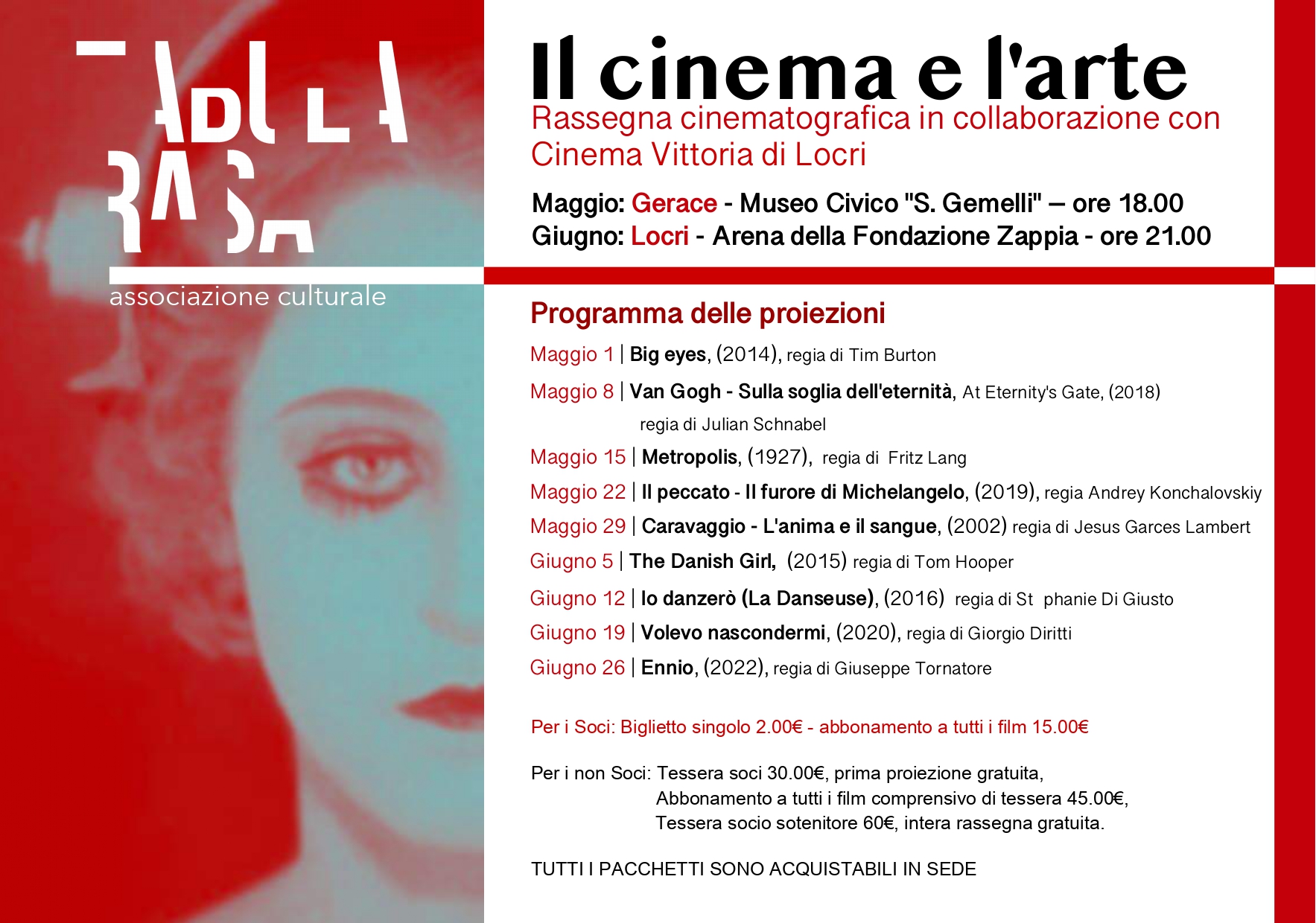 Riguardo questi ultimi, il via è stato dato ieri, domenica 1 maggio, con l’inaugurazione di una rassegna cinematografica, piuttosto suggestiva nella sua variegata proposta, che vede la collaborazione del citato Cinema Vittoria: al Museo Civico S. Gemelli di Gerace è stato infatti proiettato il film Big Eyes (Tim Burton, 2014) e nel corso del corrente mese nella stessa struttura vi saranno in cartellone altri titoli, mentre a giugno le proiezioni si sposteranno nell’Arena della Fondazione Zappia, a Locri, come potete leggere nella locandina qui di seguito.