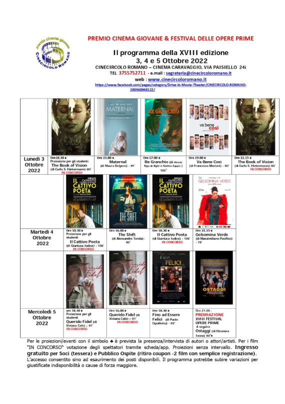 Saranno dieci le opere selezionate che concorreranno per i premi tecnici, tre, invece, per il primo premio, il cosiddetto Premio Cinema Giovane, attribuito dal pubblico e dagli studenti del Progetto di Educazione al Cinema d’Autore e dei PCTO (Percorsi per le Competenze Trasversali e l’Orientamento) e per il Premio per Opera Preferita dagli Studenti (assegnato da una giuria composta da soli studenti), ovvero The Book of Vision (Carlo S.Hintermann), Il cattivo poeta (Gianluca Iodice), Querido Fidel (Viviana Calò).