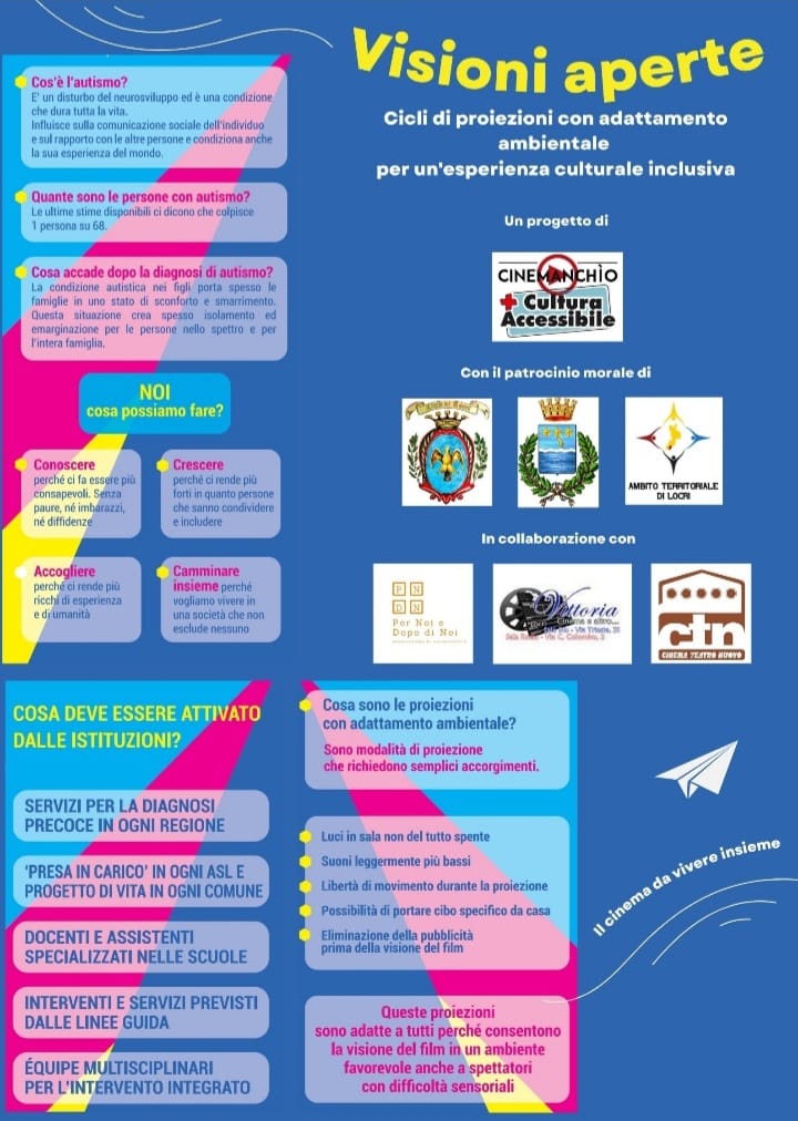 Il progetto vede poi la collaborazione con Cinemanchìo/+Culturaaccessibile e il patrocinio morale del Comune di Locri e dell’ Ambito Territoriale di Locri, cui si aggiunge quello del Comune di Siderno, ed intende promuovere l’accessibilità cinematografica e culturale per tutti, tenendo in particolare considerazione le esigenze di ragazzi e bambini con autismo.