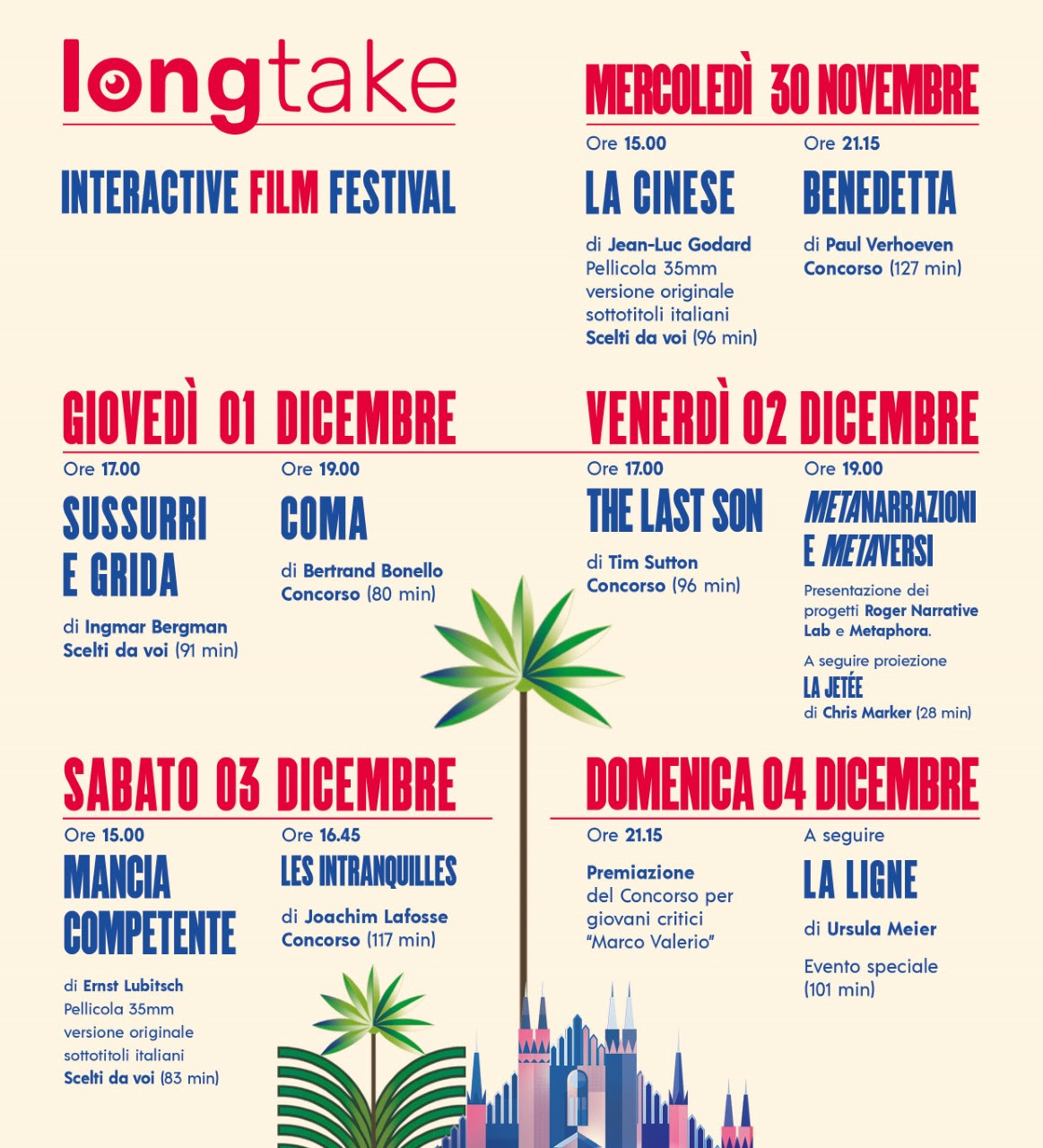 Da mercoledì 30 novembre a domenica 4 dicembre Cineteca Milano Arlecchino ospiterà la quarta edizione di Longtake Interactive Film Festival, un evento di cinema ad alto tasso di interattività dove il pubblico è attore protagonista, anche nella scelta della programmazione.