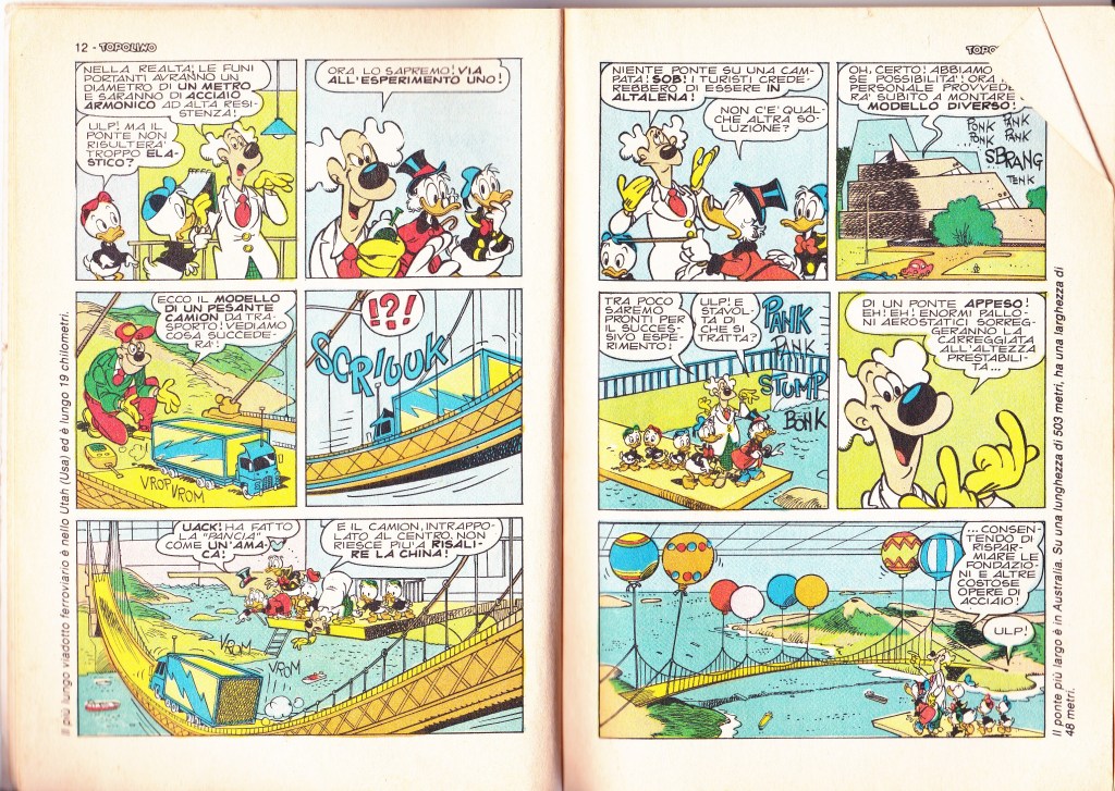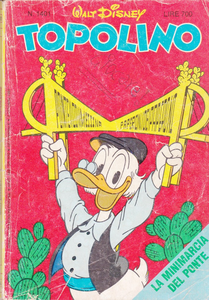 Matteo Salvini, Vicepresidente del Consiglio e Ministro per le Infrastrutture e dei Trasporti, nel portare avanti la personale campagna promozionale sull’ormai costruendo Ponte di Messina, “un sogno di onnipotenza che palesa la palese impotenza a gestirlo” (Tullio Kezich, dalla recensione del film Joan Lui. Ma un giorno nel paese arrivo io di lunedì, 1985, Adriano Celentano), ha tirato fuori dal cilindro di provetto prestigiatore, ad ulteriore sostegno di una concreta fattibilità della struttura, un numero del settimanale a fumetti Topolino (il 1401 del 3 ottobre 1982), che si apriva con la storia, disegnata da Giorgio Cavazzano e sceneggiata da Giorgio Pezzin, Zio Paperone e il ponte di Messina.