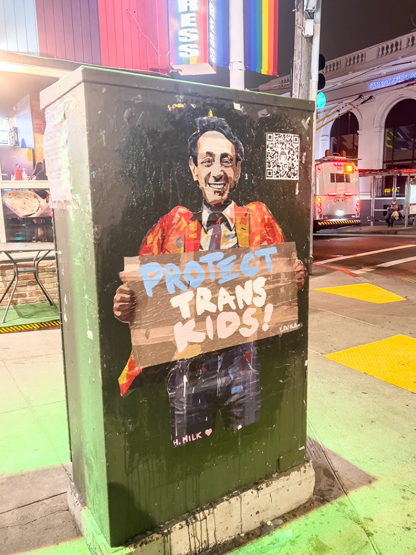 L’11 ottobre, in occasione della celebrazione del Coming out Day, è apparsa una nuova opera della street artist Laika per le vie di Castro, storico quartiere Lgbtiq+ di San Francisco, negli Stati Uniti d’America. Il poster ritrae Harvey Milk, consigliere comunale della città californiana, assassinato nel 1978, primo politico statunitense a dichiararsi apertamente gay, che espone un cartello con lo slogan Protect trans kids.