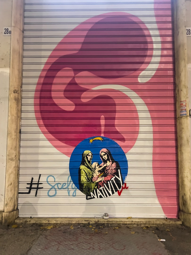 Questa mattina, domenica, 24 dicembre, è apparsa la nuova opera-provocazione della street artist Laika presso la sede di Pro-Vita e Famiglia, in viale Manzoni a Roma. L’opera, o meglio le opere, ritraggono una reinterpretazione della natività: nel primo poster Gesù bambino è insieme alle sue due mamme, due Madonne, che lo coccolano. Gesù è avvolto da fasci arcobaleno, esplicito riferimento alla bandiera LGBT. Il secondo poster, invece, ritrae San Giuseppe, falegname, che realizza una bara per il patriarcato.