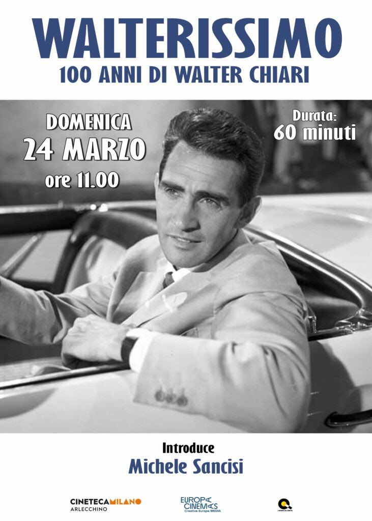 Walterissimo, che sarà proiettato al cinema Arlecchino domenica 24 marzo alle ore 11.00, condensa in 60 minuti gli episodi più rappresentativi della carriera di Chiari, proponendo scene di celebri film, sketch televisivi e Caroselli che hanno per protagonista il grande attore. Ospite in sala lo scrittore Michele Sancisi che, insieme al figlio di Chiari Simone Annicchiarico, è l’autore di 100% Walter – Biografia di un genio irregolare (Baldini + Castoldi, 480 pagine, 22 euro) e che, insieme al direttore di Cineteca Milano, Matteo Pavesi, introdurrà la proiezione. Un libro ricchissimo di testimonianze e documenti inediti, che raccoglie aneddoti sorprendenti e spassosi, facendo al contempo luce su alcuni passaggi controversi della sua vita.