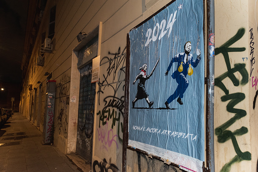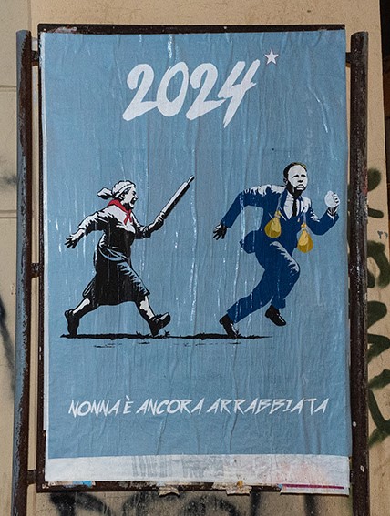 Questa mattina, giovedì 25 aprile, Giorno della Liberazione, è apparsa una nuova opera della street artist Laika dal titolo 2024: Nonna è ancora arrabbiata, affissa ancora una volta nello storico quartiere di resistenza antifascista di Roma, San Lorenzo, in via dei Sabelli. Il murale riprende l’opera dello scorso anno in cui una nonna partigiana rincorreva con un mattarello il Presidente del Senato Ignazio La Russa. Nel secondo atto di oggi, invece, a fuggire dal mattarello c’è il Ministro dell’agricoltura, Francesco Lollobrigida. “Questo governo tenta in continuazione di riscrivere la storia. La nostra Repubblica è nata con il sangue dei nostri nonni partigiani che hanno combattuto contro il fascismo. Ogni tentativo di riabilitazione di quel periodo è un atto criminale nei confronti di chi ha perso la vita, di chi è stato perseguitato nei campi di concentramento, di chi ha sofferto. Il termine antifascismo non è divisivo, è il fondamento della nostra democrazia. Ha provocato tanti morti? Forse qualcuno si è confuso col regime fascista, un regime che si è alleato con Adolf Hitler“, ha dichiarato l’artista. “La storia non si riscrive, la memoria va preservata, protetta, difesa dalla censura. È compito delle nuove generazioni mantenere questo impegno affinché ciò che è stato non si ripeta più“, ha concluso Laika.