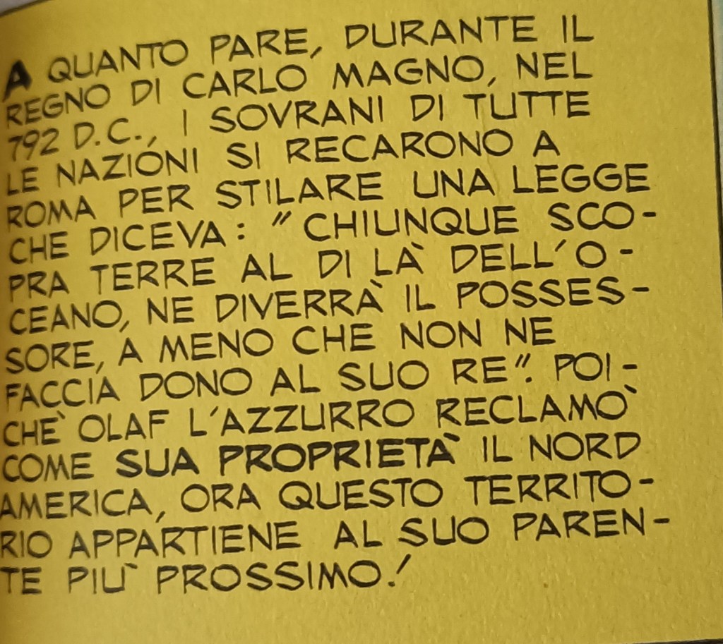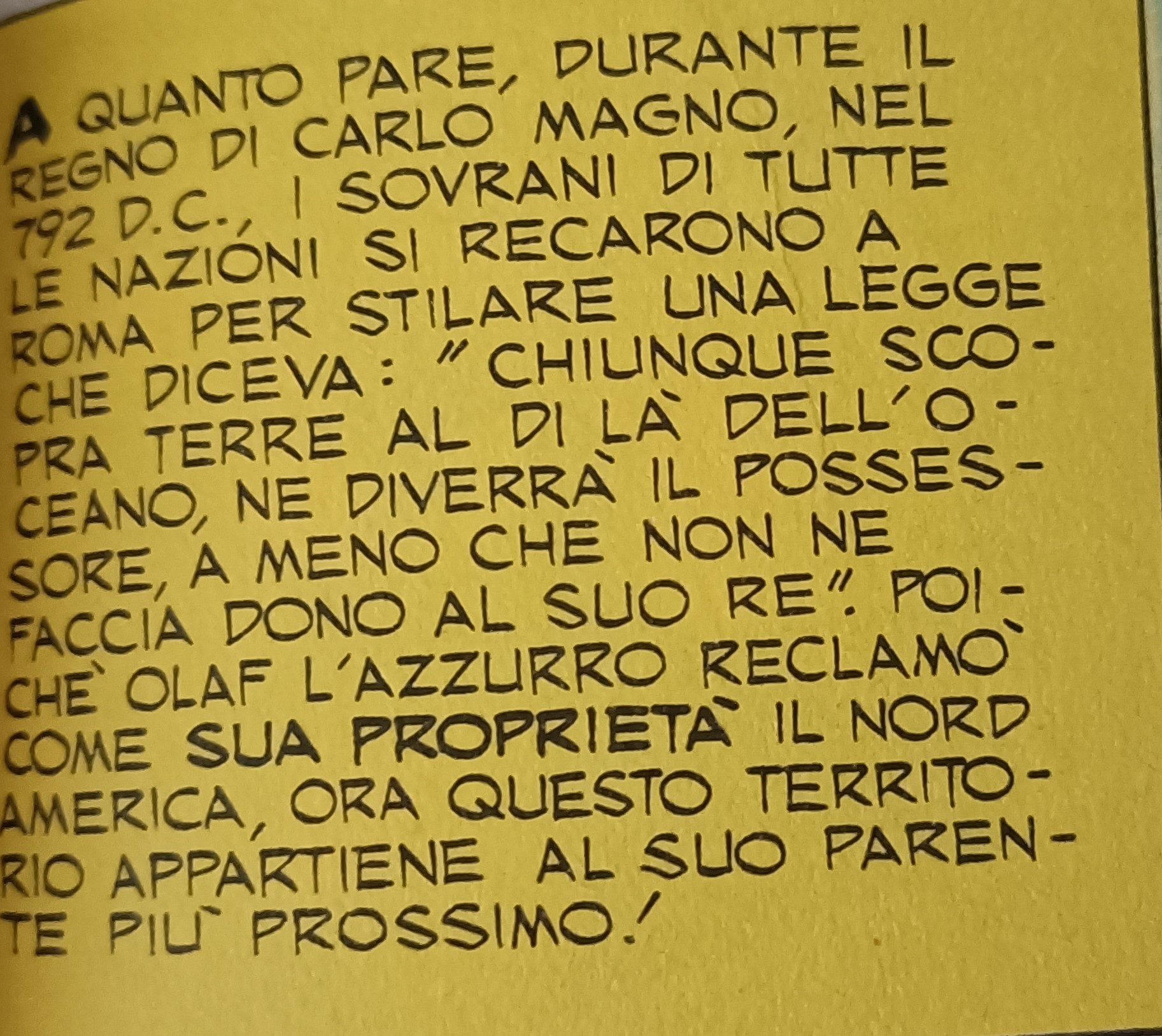 Se per Olaf il suo possesso sta a significare l’appropriarsi di tutto ciò che esiste sul territorio nordamericano, persone comprese, quest’ultime da ridurre in schiavitù facendole sgobbare anche la domenica, ecco che per il direttore del museo, ovviamente sostenuto nella legalità del possesso dal perfido Sharky (che chiede come parcella “una fettina del continente, diciamo il Canada!”, sempre che la cosa non finisse in tribunale, caso in cui chiederebbe il Texas e anche New York…), tutto si risolverà a beneficio dei musei (“tutti dovranno visitare un museo almeno due volte al giorno!”).
