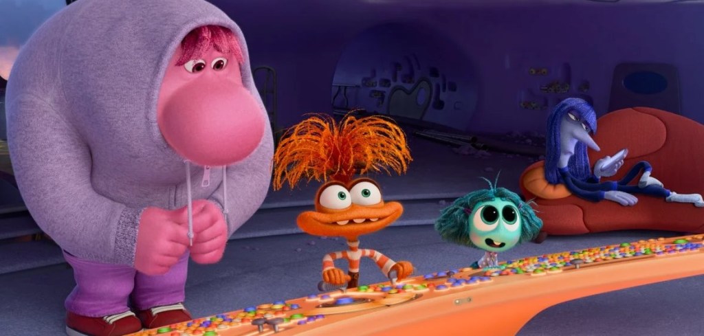 Le stesse nuove entrate, a partire da Ansia, raffigurata come, personale sensazione, una sorta di nevrastenico connubio tra il primissimo Daffy Duck e Woody Woodpecker, proseguendo con Imbarazzo, ragazzone infagottato in una tuta da ginnastica a mo’ di barriera protettiva, Ennui (ovvero Noia, in francese, non a caso rappresentata a metà strada tra l’esistenzialista e il bohémien) e concludendo con Invidia, non sempre offrono caratterizzazioni del tutto incisive, bensì, a mio avviso, schematiche, vedi la predisposizione ansiogena intesa a “tavolinizzare” l’avvenire, prefigurando vari eventi nefasti e facendo sì che la personalità di Riley si conformi a quella altrui, in nome di un compiacimento asservente.