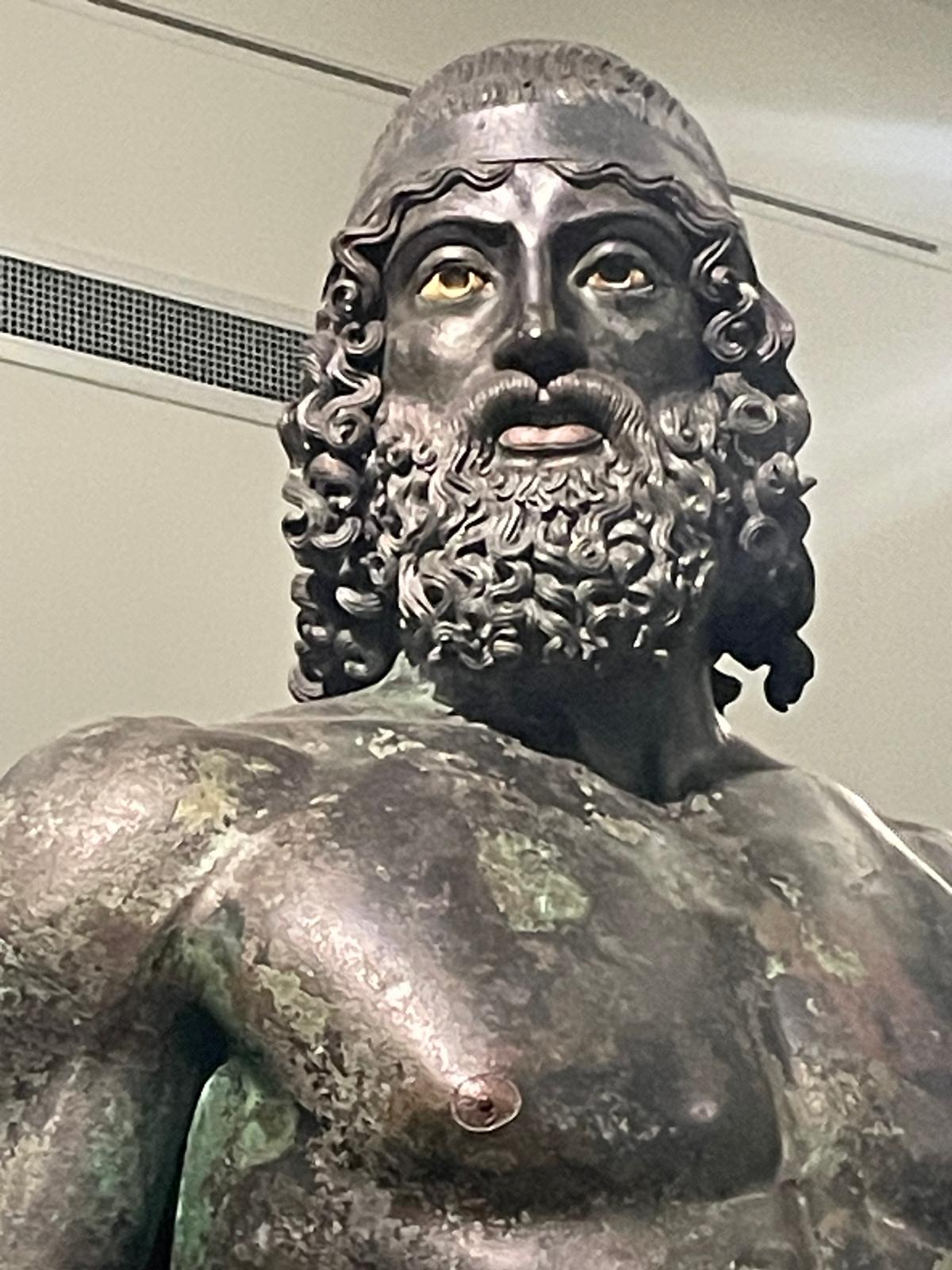 Se ognuna delle 220 vetrine ha suscitato il mio interesse ed alimentato la mia curiosità, rendendomi edotto di tante cose che non conoscevo, inutile negare che la malia più grande sia stata quella alimentata dalla visione dei due Bronzi, rinvenuti nella profondità delle acque marine di Riace nel 1972, fulgido esempio di perfezione e bellezza, avvolti dal fascino suggestivo del mistero delle loro origini, riguardo le quali varie tesi si sono prospettate negli anni.