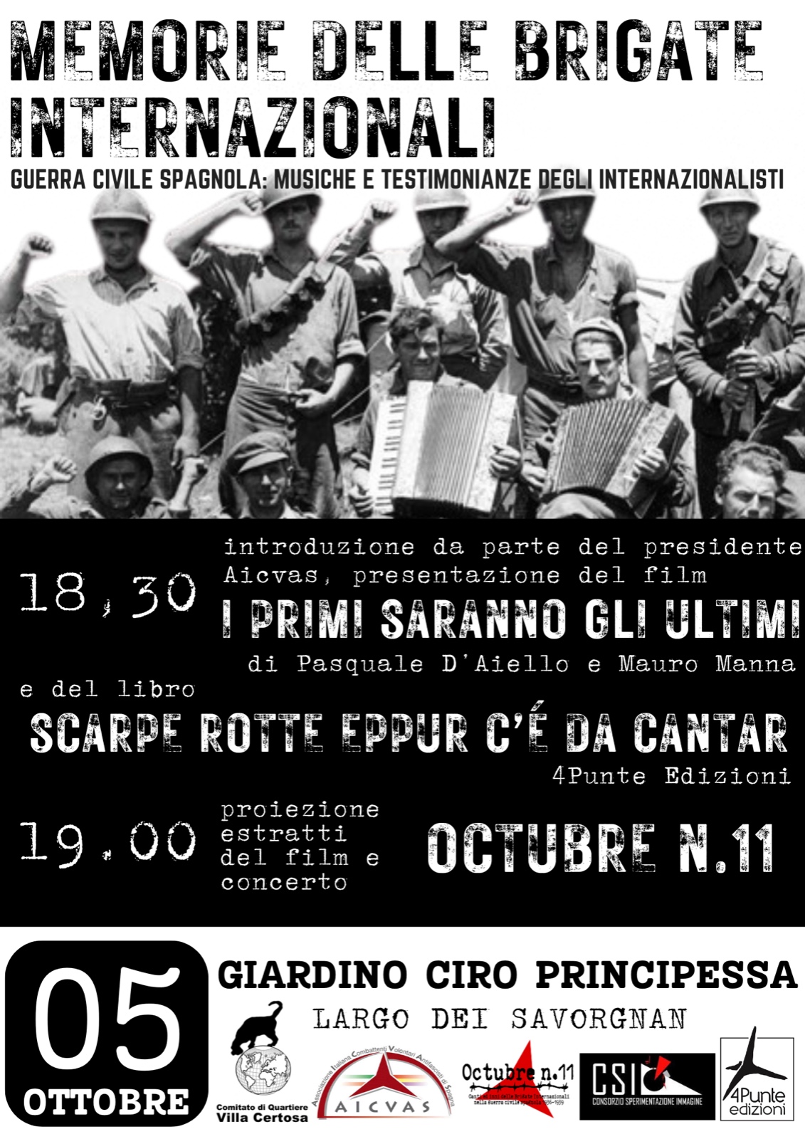 Abbiamo creato un percorso fatto di immagini del nostro film, I primi saranno gli ultimi, legato alle canzoni della guerra civile spagnola. Ci saranno gli autori del film, Pasquale D’Aiello e Mauro Manna, che racconteranno le storie dei personaggi intervistati e gli Octubre n.11 presenteranno anche il loro libro Scarpe rotte eppur c’è cantar, interverrà il presidente dell’AICVAS, Italo Poma.
