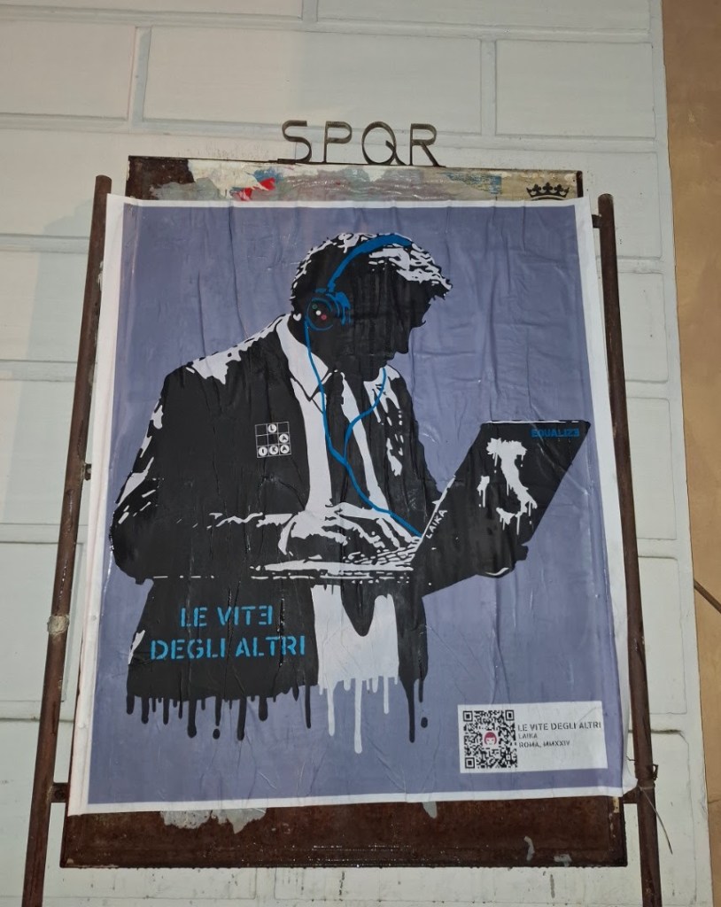 La notte del 28 ottobre, a Piazza San Bernardo, Roma, è apparsa una nuova opera della street artist Laika dal titolo Le vite degli altri. Il poster, affisso a pochi passi dall’Agenzia per la Cybersicurezza Nazionale, ritrae un hacker che spia attraverso il computer l’intero paese. Il titolo dell’opera riprende l’omonimo film di Florian Henckel von Donnersmarck, vincitore del premio Oscar come Miglior Film Straniero, la cui narrazione era incentrata sullo spionaggio ai tempi della DDR.