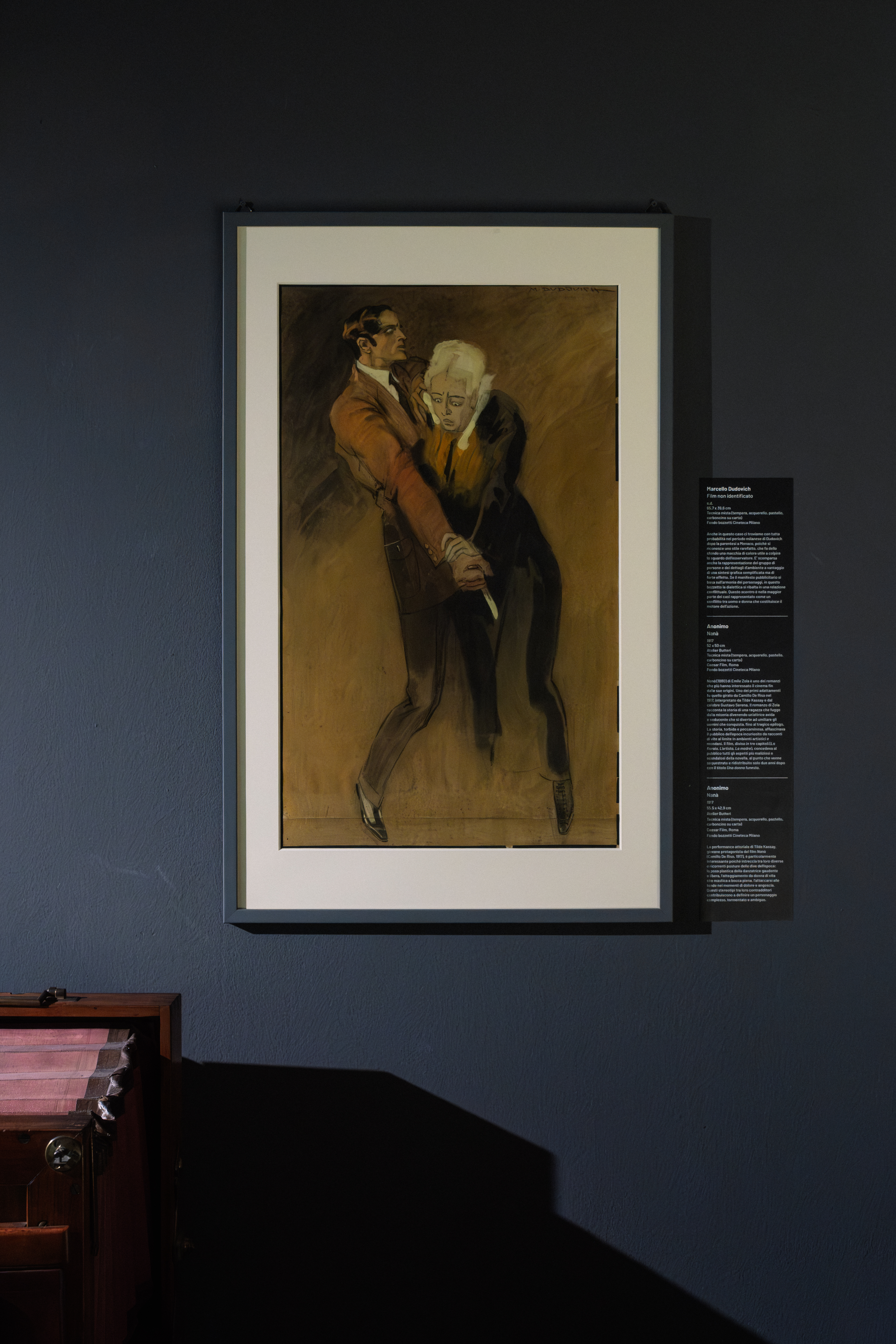 Nati nella seconda metà dell’Ottocento, i primi cartellonisti cinematografici italiani si formano in ambienti artistici classici; la maggior parte frequenta le Accademie di Belle Arti ma non sono meno frequenti i casi di formazione autodidatta, magari tramite un percorso più improntato al disegno. Dei ventisei lavori esposti e restaurati da Cineteca Milano, nove sono attribuibili a Dudovich, tre ad Alfredo Ortelli, due a Giovanni Vianello, uno a Tito Corbella, Filippo Omegna ed Enrico Sacchetti, mentre i rimanenti non hanno alcun segno distintivo che li possa ricondurre a un autore specifico. Ai bozzetti si aggiungono anche due manifesti dello stesso Marcello Dudovich prestati dalla Fondazione Massimo e Sonia Cirulli, San Lazzaro di Savena (BO), per i film muti Piccola ombra di Bianca Virginia Camagni e Ugo Falena (1916) e Severo Torelli di Louis Feuillade (1914), e un manifesto proveniente dalla Direzione Regionale Musei Veneto – Museo Collezione Salce Treviso, per il film L’uomo che voglio di Sam Wood (Hold Your Man, 1933).