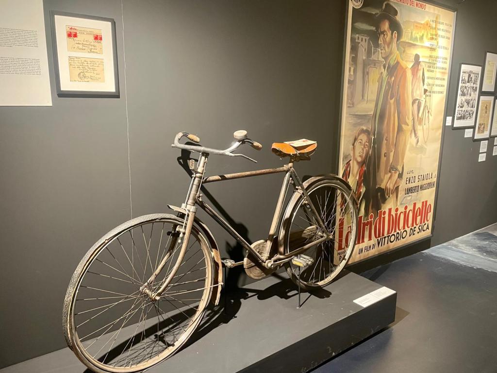 Ecco poi l’incontro con Chaplin, la preziosa collaborazione con Zavattini, gli Oscar che hanno suggellato i suoi film, la bicicletta più famosa della storia del cinema, quella che il neo assunto attacchino comunale Antonio Ricci (Lamberto Maggiorani), insieme alla moglie Maria (Lianella Carell), riusciva a riscattare pignorando le lenzuola, essendogli necessaria per lo svolgimento del mestiere (Ladri di biciclette, 1948). Quanto esposto alla Galleria Modernissimo consente di prendere consapevolezza sia della nostra storia patria inerente al Novecento, sia della particolare personalità di De Sica, colta nei suoi momenti privati così come in quelli che lo vedevano attore e regista sui palcoscenici o sui set dei film, ma anche cantante ed uomo di spettacolo, prendendo il via dalla gavetta teatrale che ne impostò la formazione e concludendo il percorso con una sezione che consente più di una riflessione sulla sua eredità artistica.