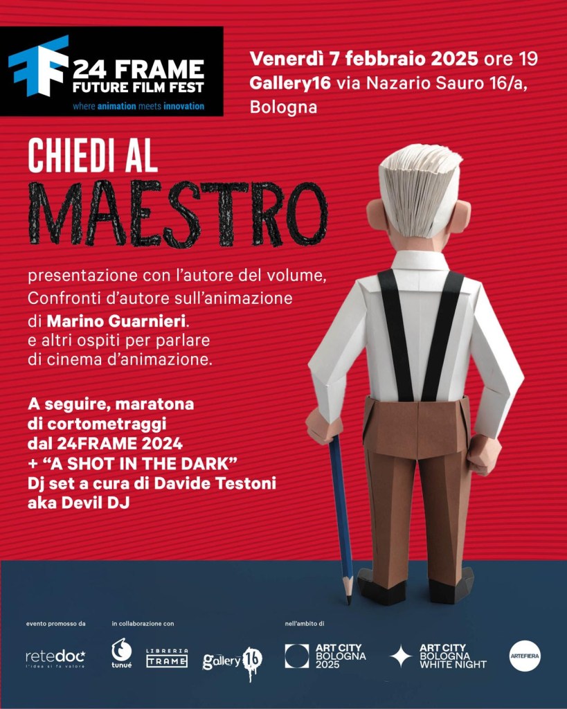 Domani, venerdì 7 febbraio, a Bologna, nell’ambito di Art City 2025 – la manifestazione che celebra l’arte contemporanea promossa dal Comune di Bologna e BolognaFiere in occasione di Arte Fiera – 24Frame Future Film Fest offrirà un’occasione unica per tutti gli appassionati di cinema d’animazione. Alle ore 19:00 Gallery 16 ospiterà l’evento Chiedi al Maestro!, una serata dedicata alla magia dell’animazione e ai protagonisti di questo straordinario linguaggio visivo, che vedrà la partecipazione di Marino Guarnieri, uno dei registi del pluripremiato Gatta Cenerentola, che presenterà il suo ultimo libro Chiedi al maestro. Confronti d’autore sull’animazione (ed. Tunué, 2024). Il volume esplora la carriera del regista e animatore che si interroga sul significato del suo lavoro in relazione ai grandi maestri dell’animazione. Attraverso una serie di dialoghi con “mostri sacri” come Bruno Bozzetto, Bill Plympton e Michel Ocelot, Guarnieri cerca di scoprire come mantenere viva la passione e l’autenticità nel proprio lavoro creativo.