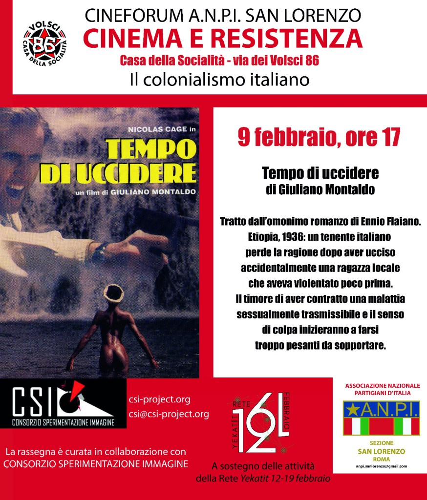 Domenica 9 febbraio, alle ore 17.00, alla Casa della Socialità, via dei Volsci 86 – Roma, proseguirà la nuova stagione di proiezioni dedicate alle resistenze, organizzata dalla sez. ANPI di Roma – San Lorenzo e da CSI-Consorzio Sperimentazione Immagine. Per approfondire il tema del colonialismo Italiano sarà proiettato il film Tempo di uccidere (1989), diretto da Giuliano Montaldo, tratto dall’omonimo romanzo di Ennio Flaiano del 1947 ed ambientato nel 1936, nel corso del conflitto italo-etiopico. Interpreti principali: Nicholas Cage, Giancarlo Giannini, Ricky Tognazzi, Franco Trevisi, Georges Claisse.(Fonte, testo e immagini: comunicato stampa)